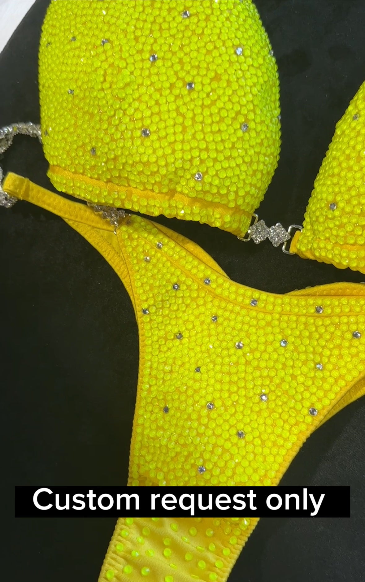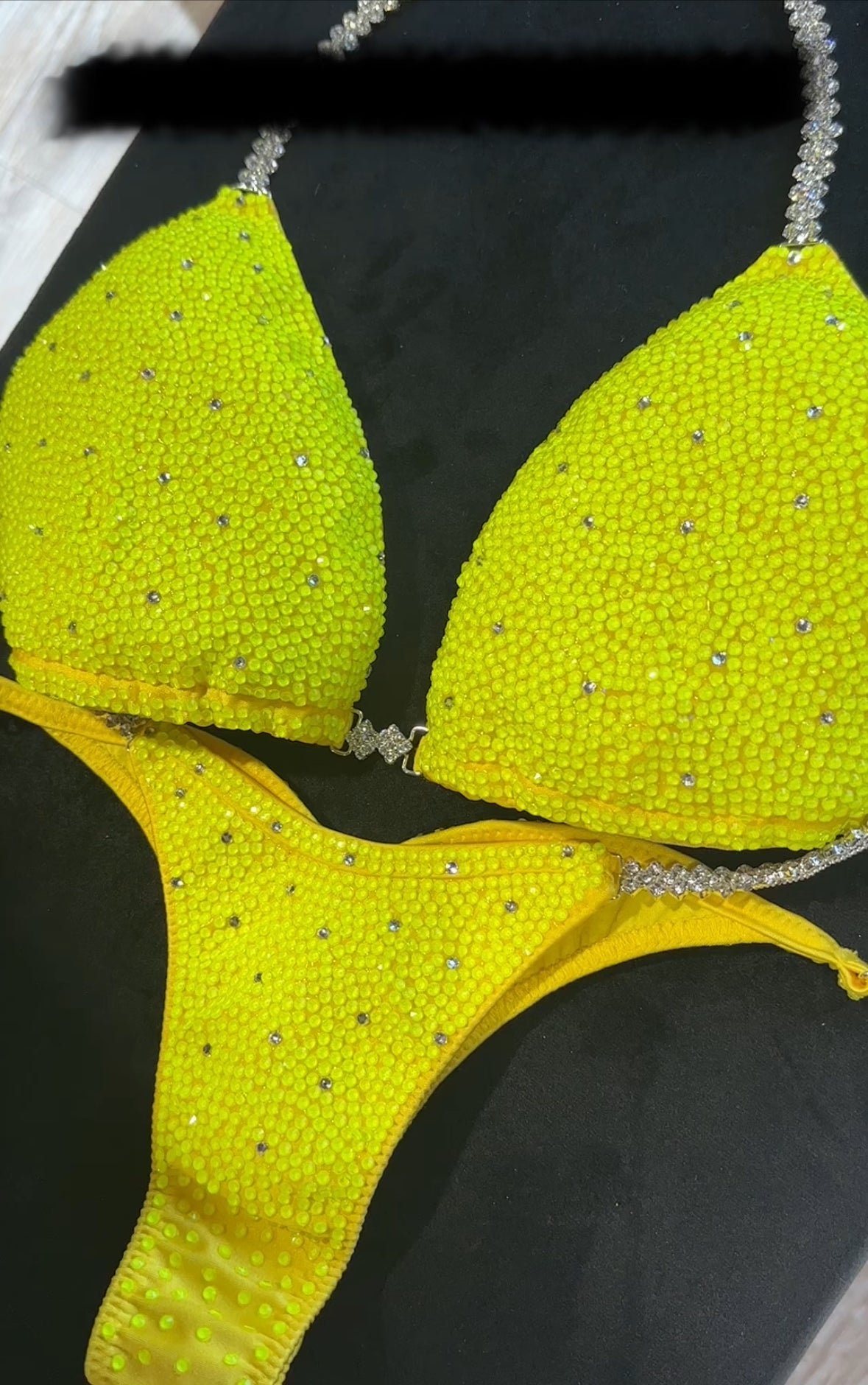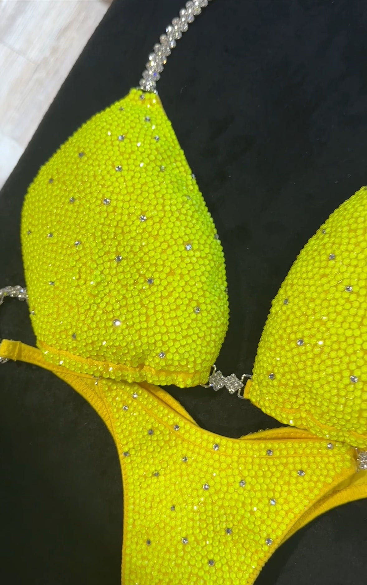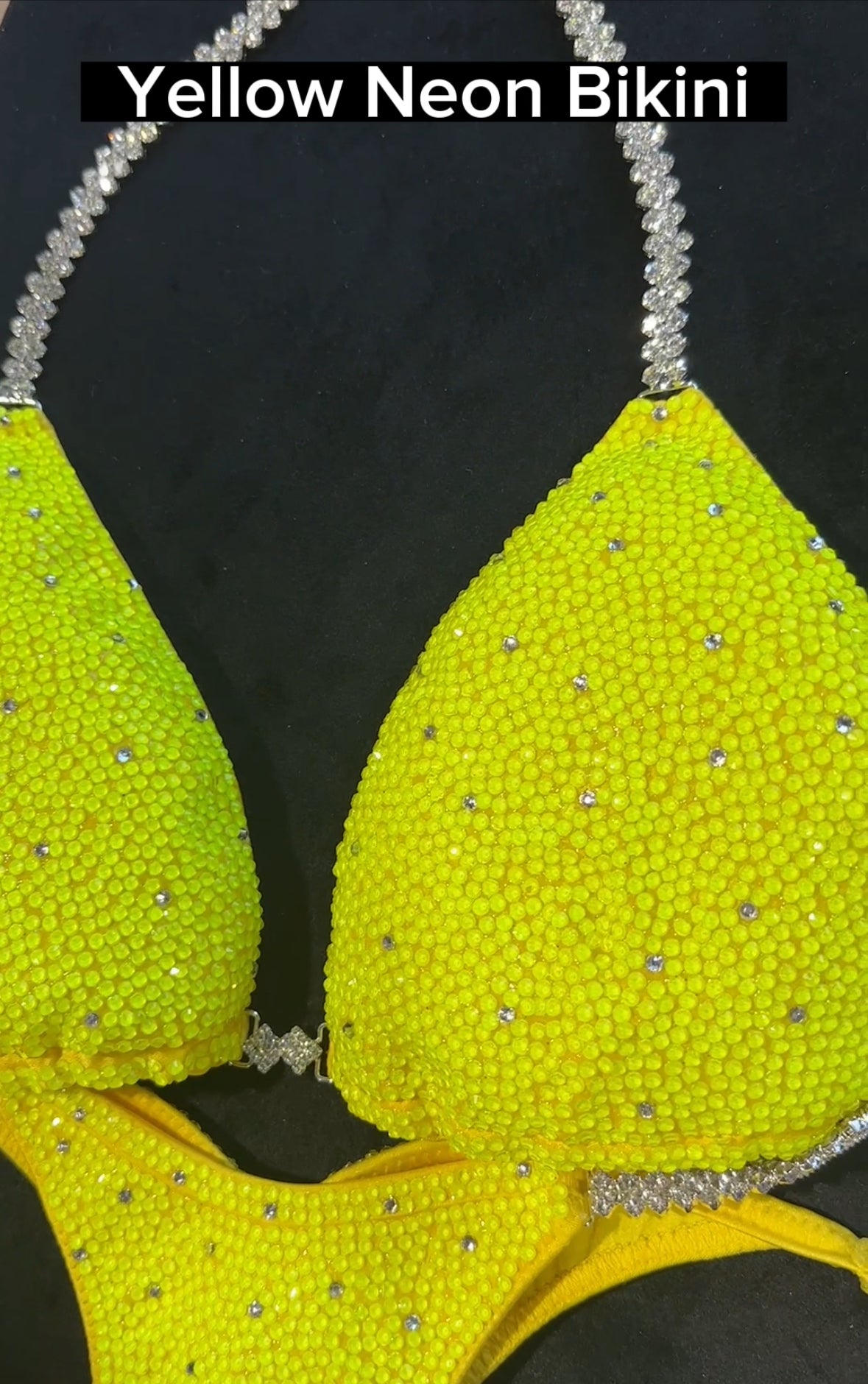 Shine bright with Yellow Neon Competition Bikini and be the luminary of the show. It's more than a garment; it's a symbol of your determination, designed to accompany you as you claim your victory under the bright lights of esteemed fitness platforms.