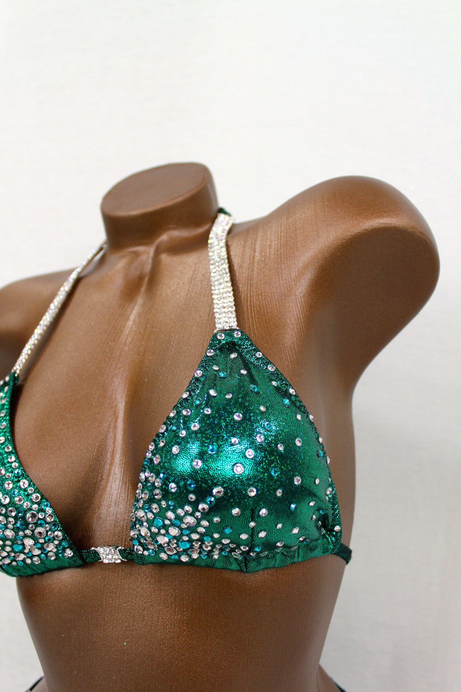 - Features: Triple crystal clear rhinestone connectors at the bra, double and two hanging lines crystal clear connectors, decorated with crystal clear and teal rhinestones in various size, scrunch back, rio back coverage