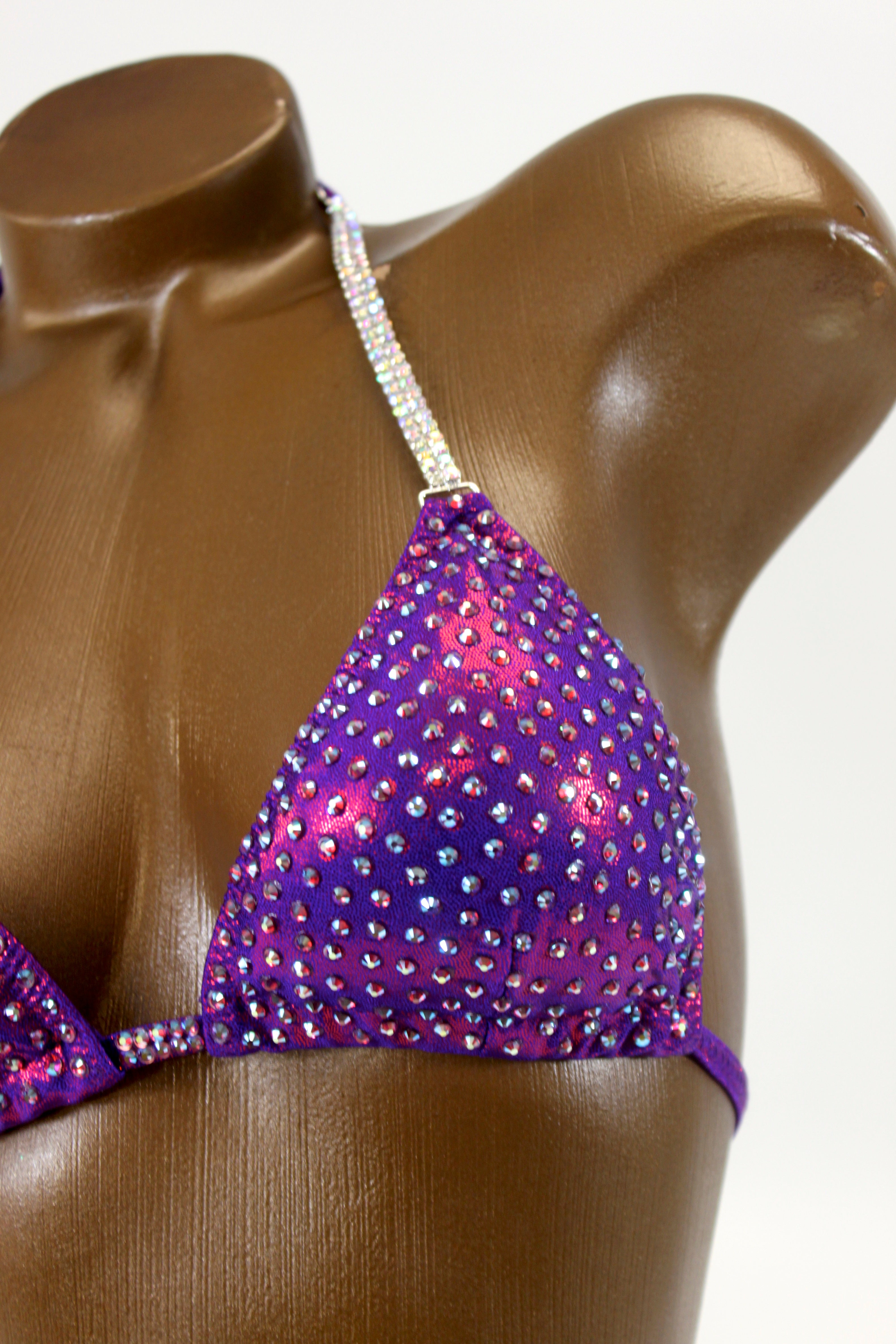 - Features: Double close up crystal AB rhinestone connector at hips & bra, decorated with fuchsia AB rhinestones, scrunch back, rio back coverage