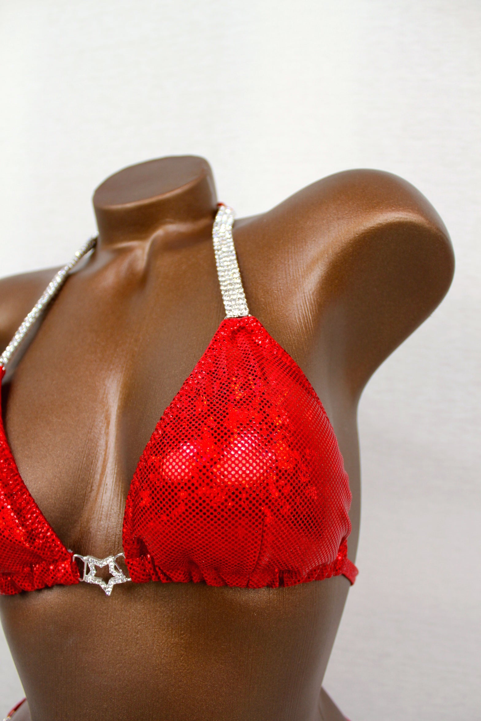 - Features: Triple closeup crystal clear rhinestone connectors at the bra, crystal clear star connector at the center bra, triple hanging crystal clear connectors at the hips, scrunch back, moderate back coverage