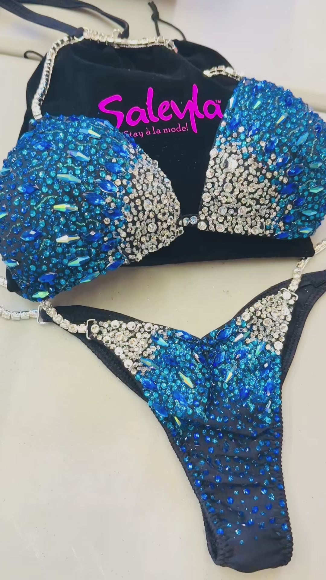 - Features: Single crystal clear & sapphire blue rhinestone connector at hips and bra, decorated with crystal clear, capri blue & sapphire rhinestones, sparkling glitter detail, scrunch back, moderate back coverage