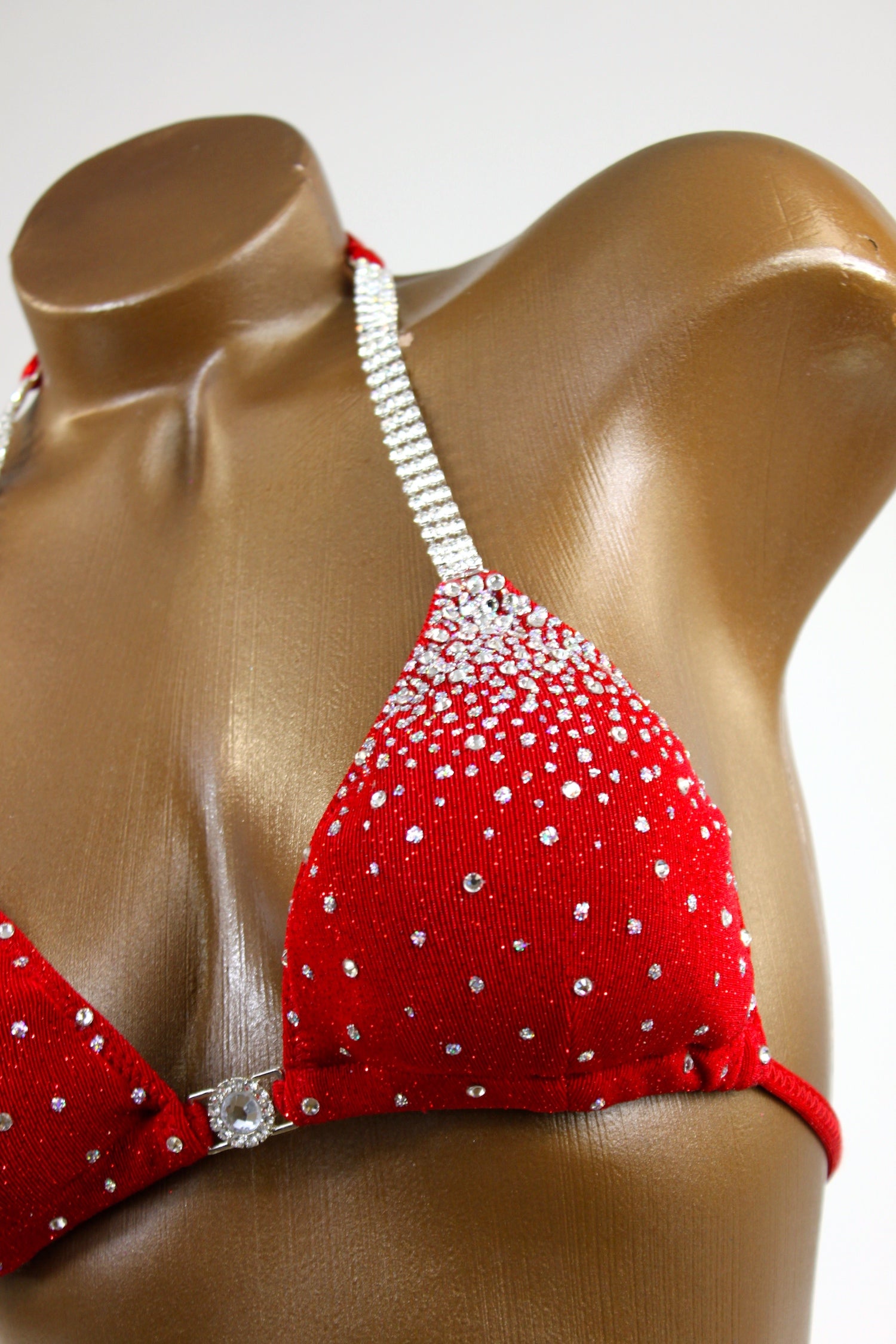 - Features: Triple hanging crystal clear loop rhinestone connectors at hips, triple connectors at bra, decorated with crystal clear rhinestones, sparkling glitter detail, scrunch back, moderate back coverage
