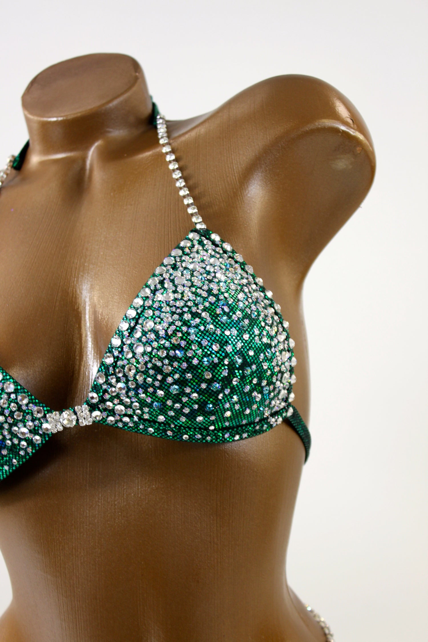 - Features: Single crystal clear rhinestone connectors at hips & bra, decorated with crystal clear, emerald AB & teal rhinestones, sparkling glitter detail, scrunch back, rio back coverage