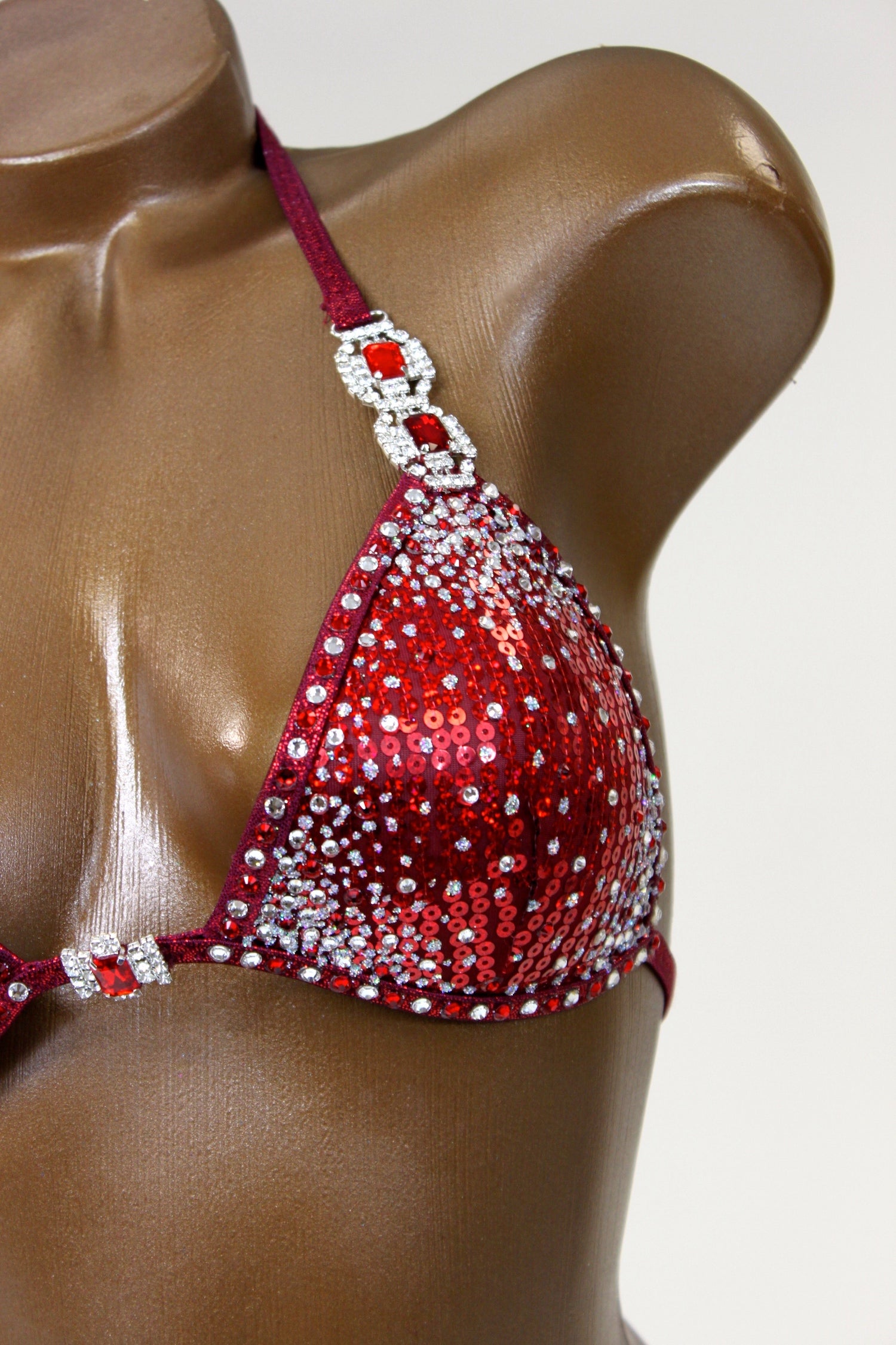 - Features: Crystal clear & red rhinestone connectors at hips & bra, decorated with crystal clear & red rhinestones in various size, sparkling glitter detail, scrunch back, rio back coverage