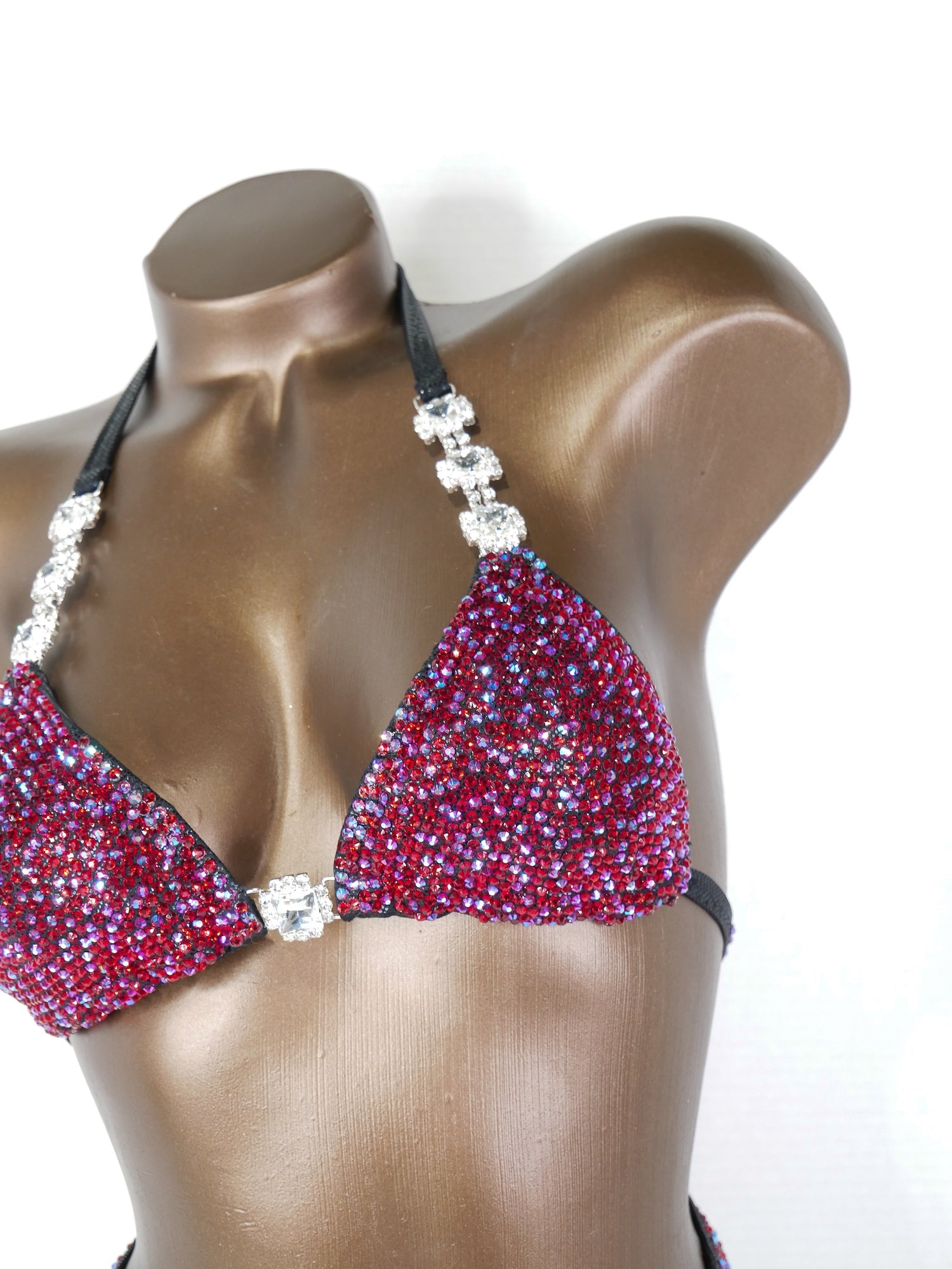 This bikini is designed using hot press czech rhinestones, applied at once to create affordable bikinis.