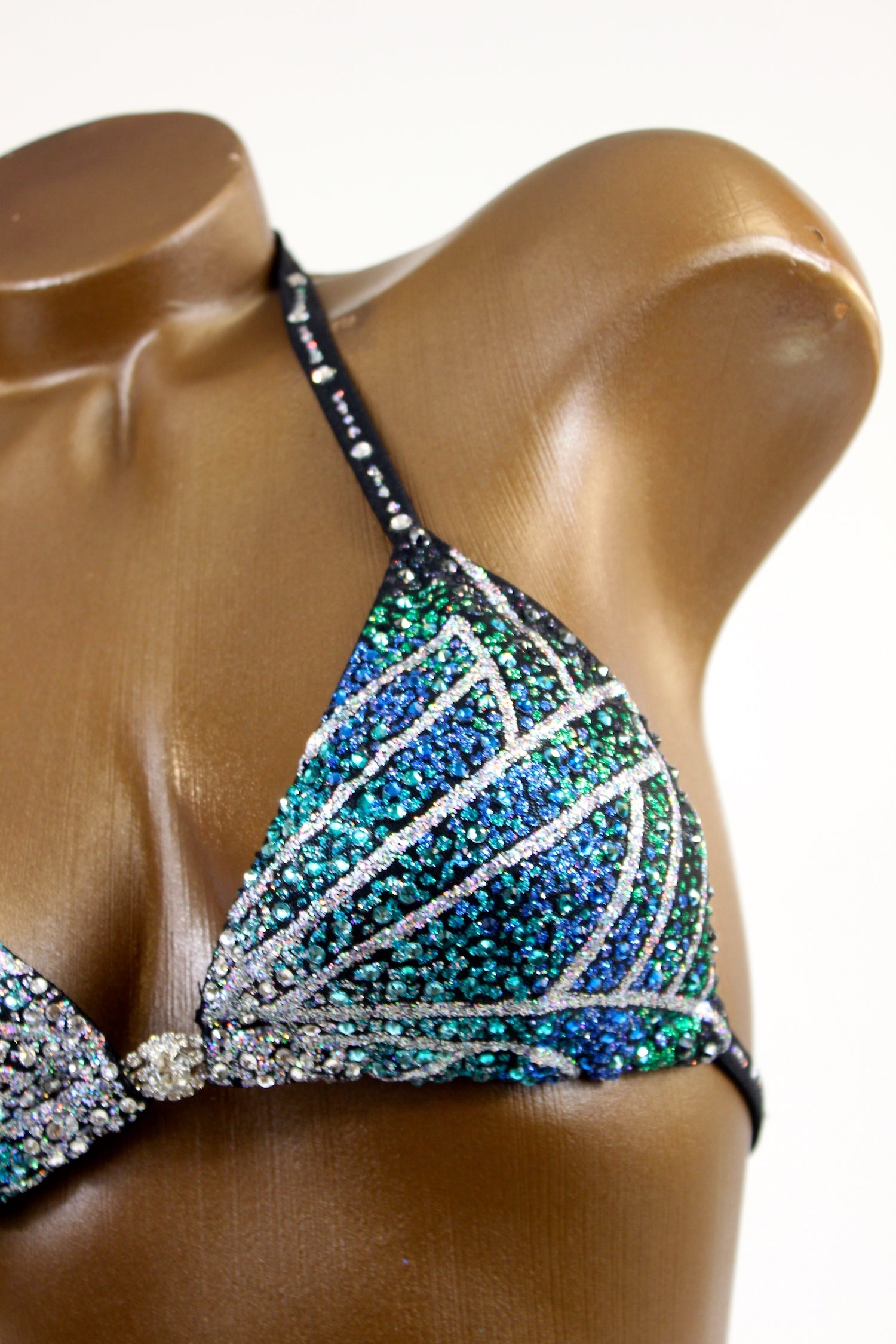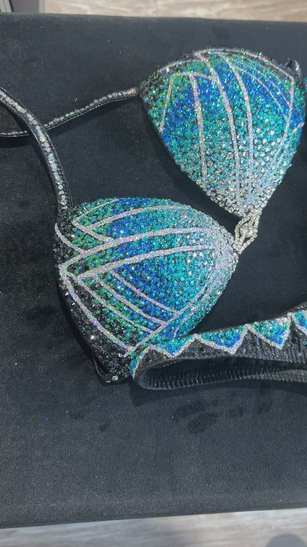 - Features: Accent center rhinestone connector, decorated with crystal clear, light turquoise, sapphire, emerald AB & jet hematite rhinestones, sparkling glitter detail, rio back coverage, fully lined