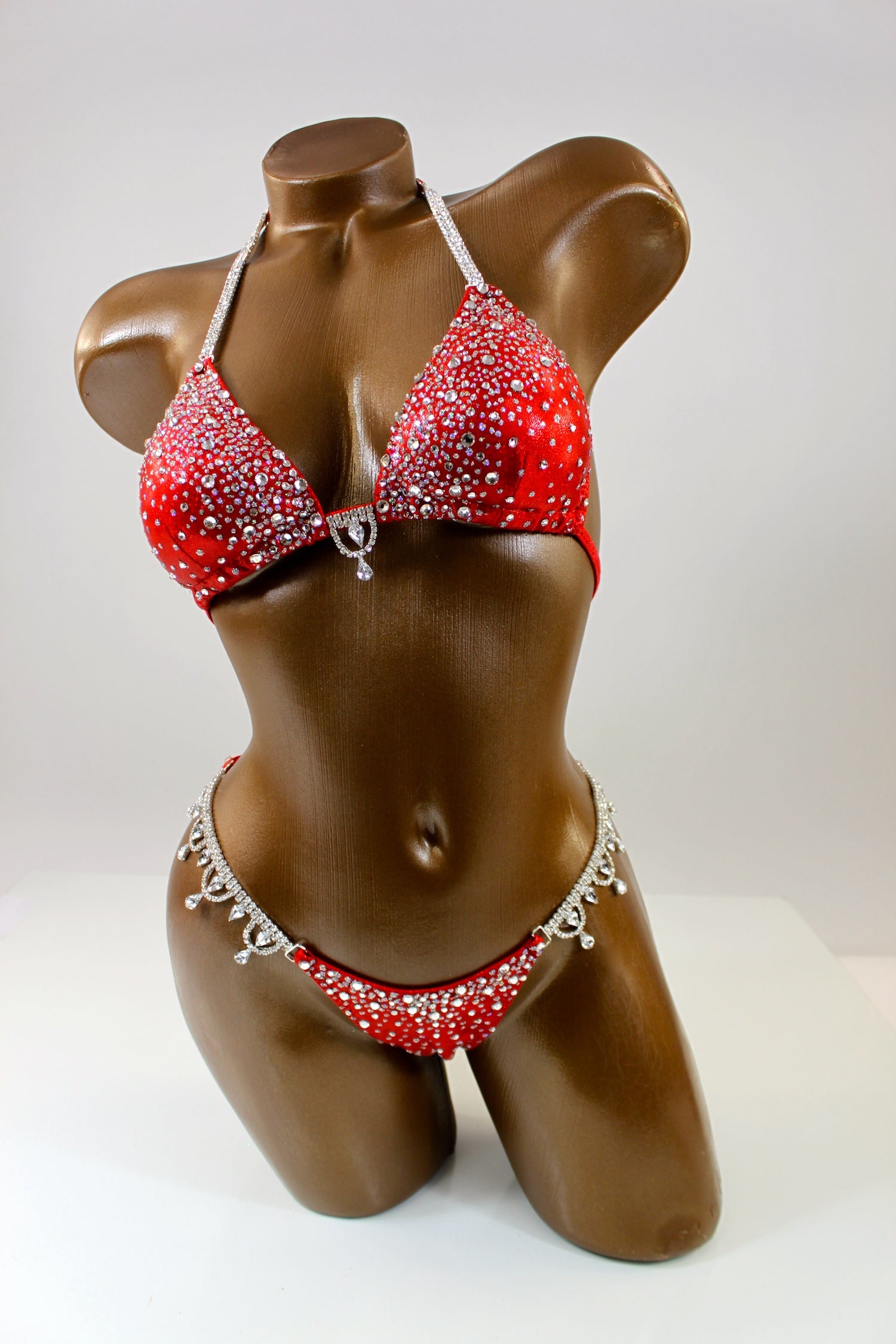 - Features: Crown crystal clear rhinestone connector at hips, double close up crystal clear rhinestone connectors at bra, decorated with crystal clear rhinestones, sparkling glitter detail, scrunch back, rio back coverage