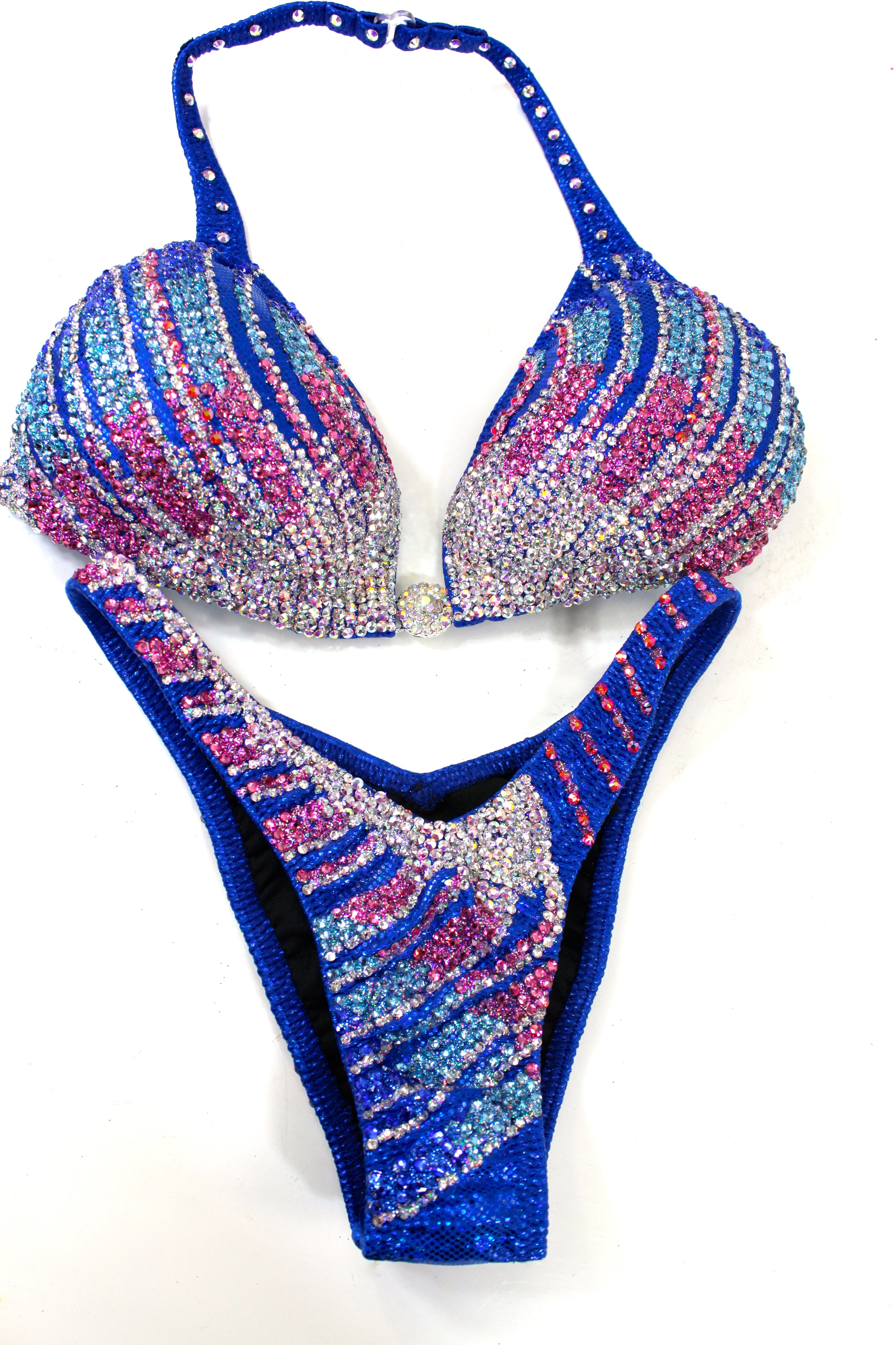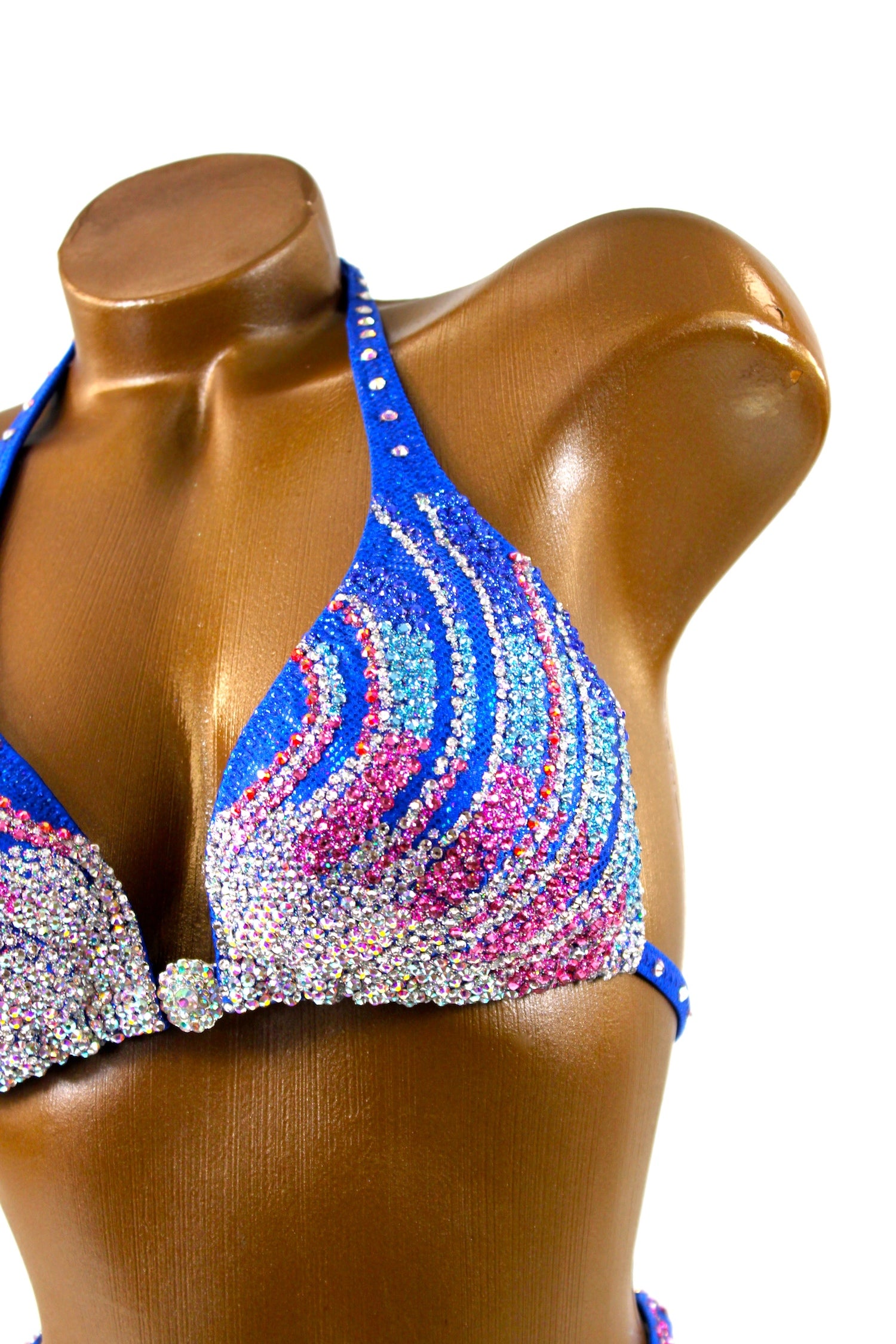 - Features: Crystal AB flower rhinestone connector at the center bra, decorated with crystal AB, crystal clear, rose, light aquamarine, sapphire & hyacinth AB rhinestones, sparkling glitter detail, rio back coverage, fully lined