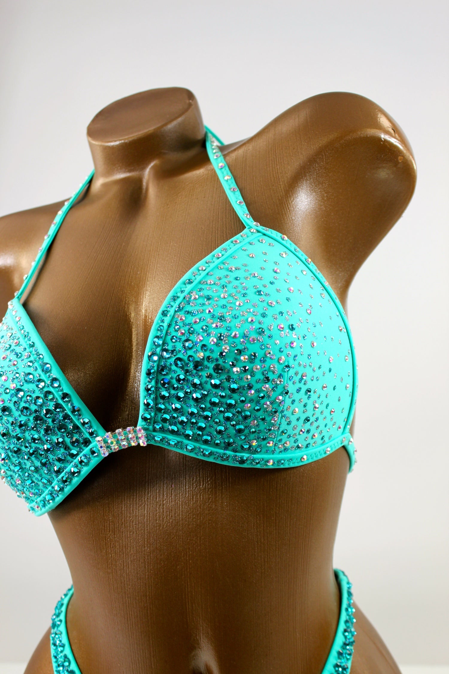 - Features: Triple crystal AB rhinestone connectors at center bra, decorated with crystal AB & teal rhinestones in various size, sparkling glitter detail, rio back coverage, fully lined