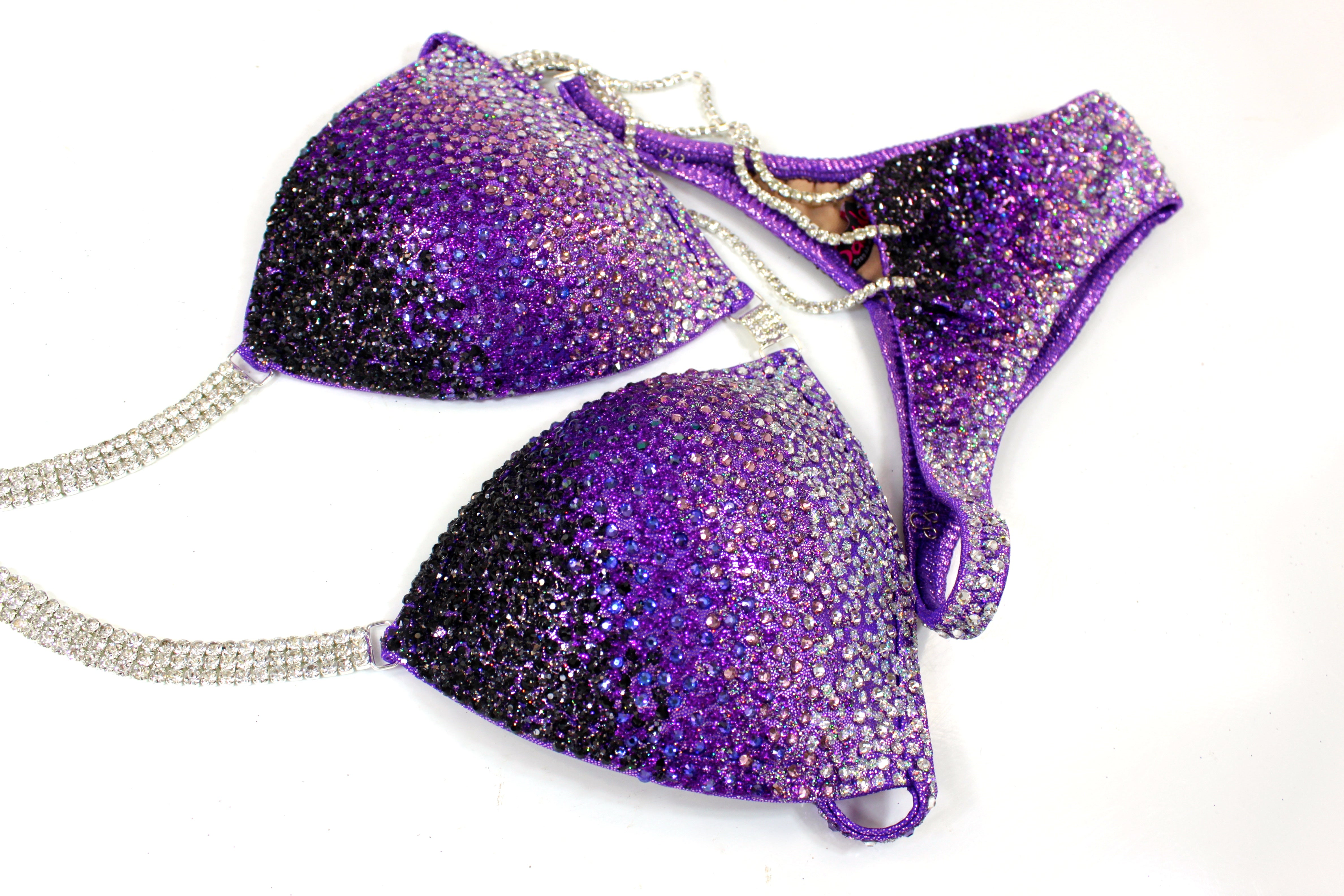 - Features: Triple crystal clear rhinestone connector at bra, decorated with black, purple, light purple & crystal clear rhinestones, sparkling glitter detail, pro cut rio back coverage, fully lined
