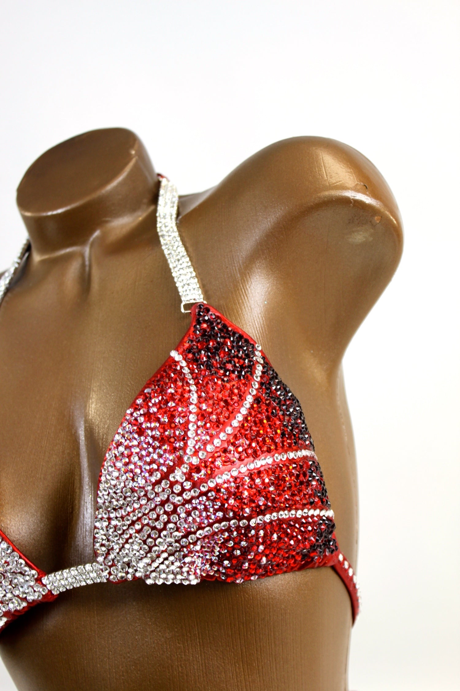 - Features: Triple close up crystal clear rhinestone connectors at bra, decorated with crystal clear, red AB, red & dark red rhinestones, pro cut rio back coverage, fully lined