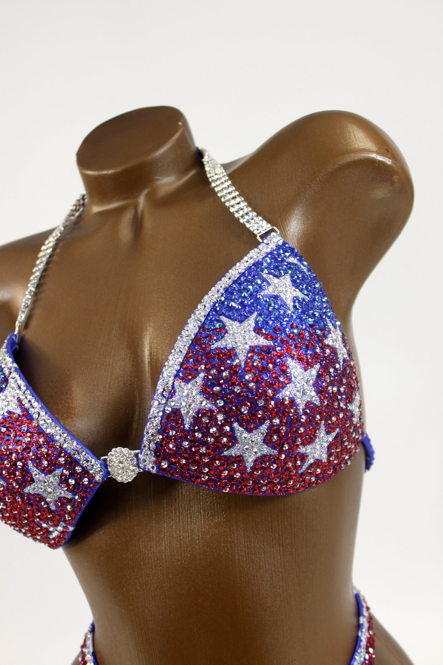 - Features: Triple crystal clear rhinestone connectors at bra, flower center connector, decorated with crystal clear, sapphire, red, red AB & capri blue AB rhinestones, sparkling glitter detail, rio back coverage, fully lined