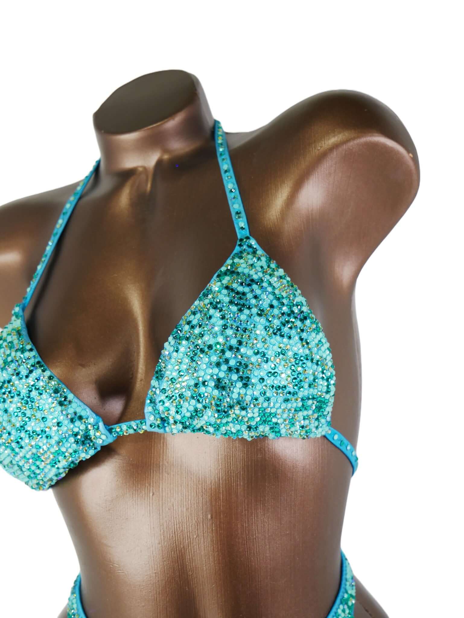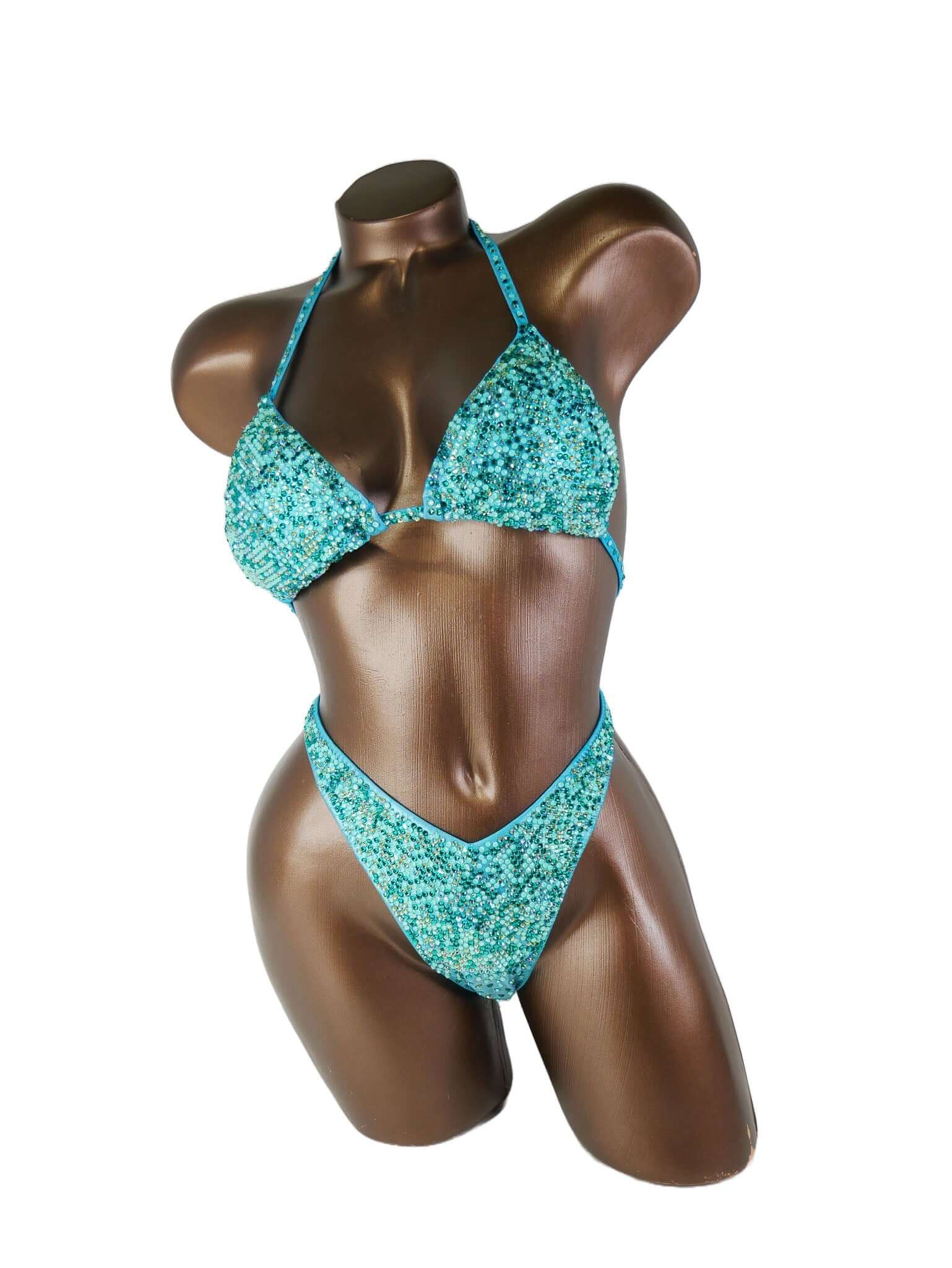 This bikini is designed using hot press czech rhinestones, applied at once to create affordable bikinis.