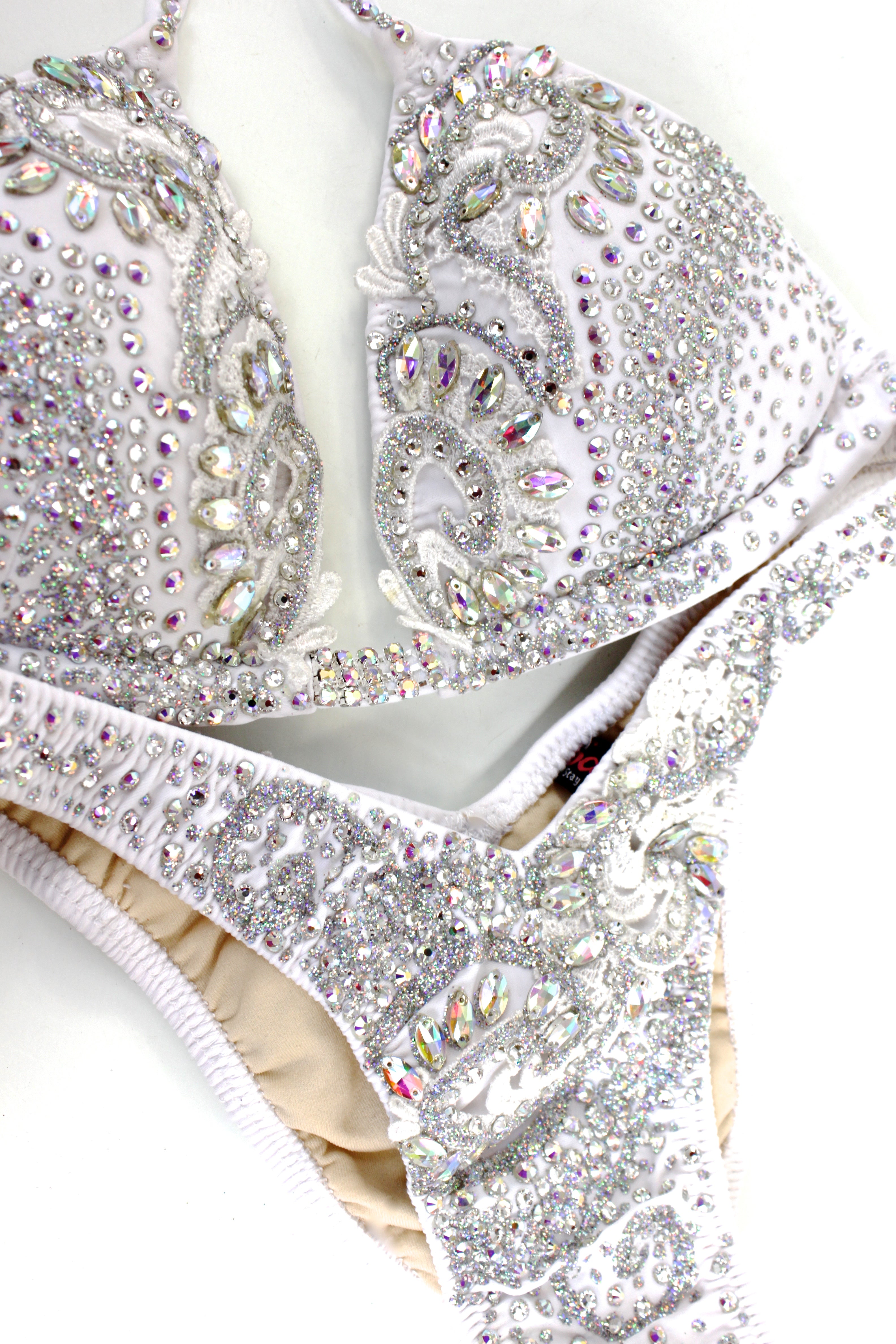 - Features: Crystal AB rhinestone connectors at center bra, decorated with crystal clear & crystal AB rhinestones, white lace applique, sparkling glitter detail, moderate back coverage, fully lined
