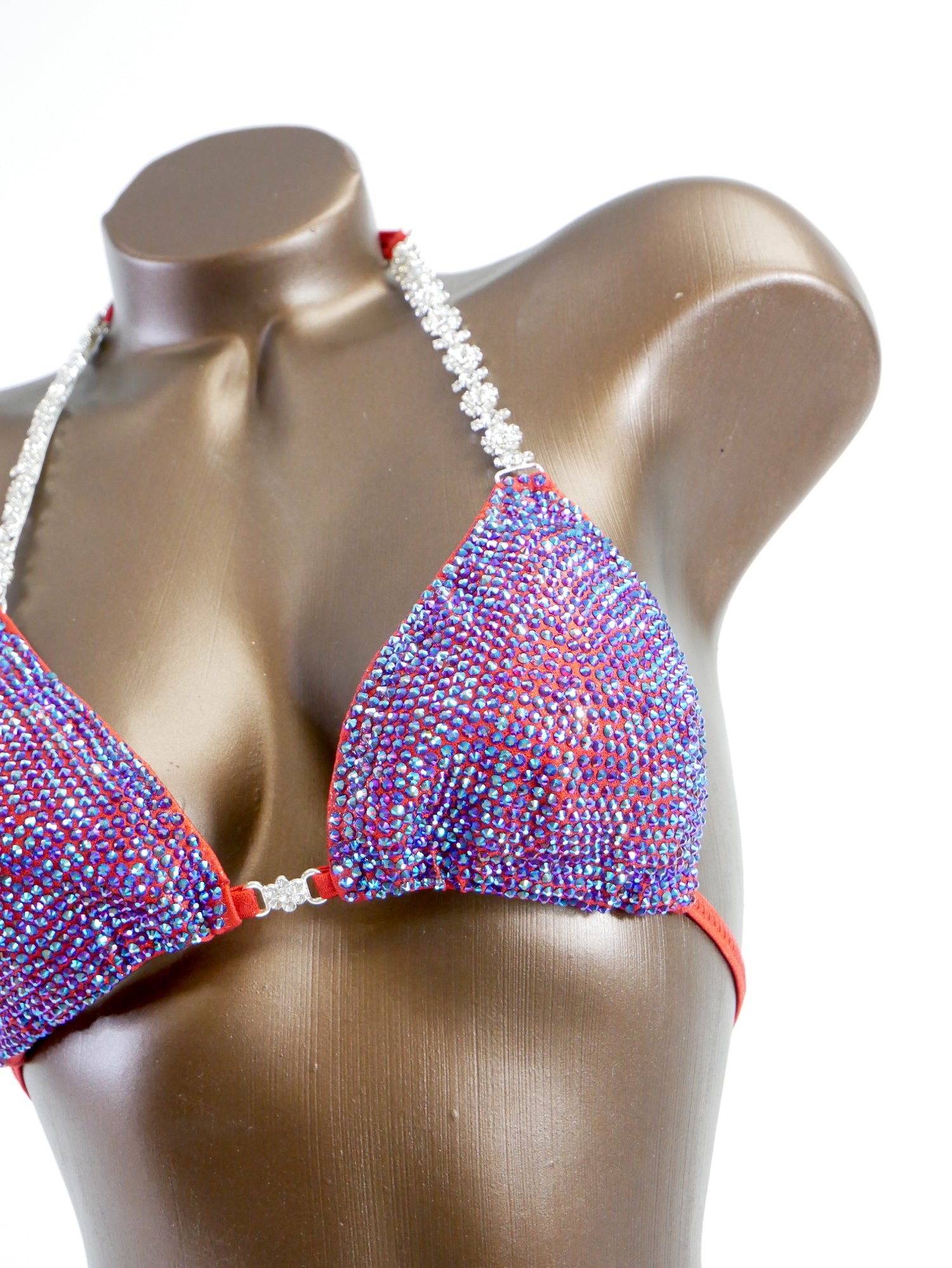 This bikini is designed using hot press czech rhinestones, applied at once to create affordable bikinis.