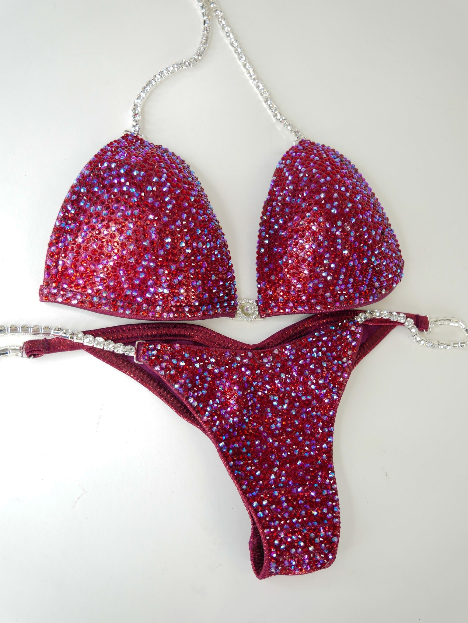 - Features: Single crystal clear rhinestone connector at the bra, decorated with dark red & dark red AB rhinestones, scrunch back, Rio back coverage