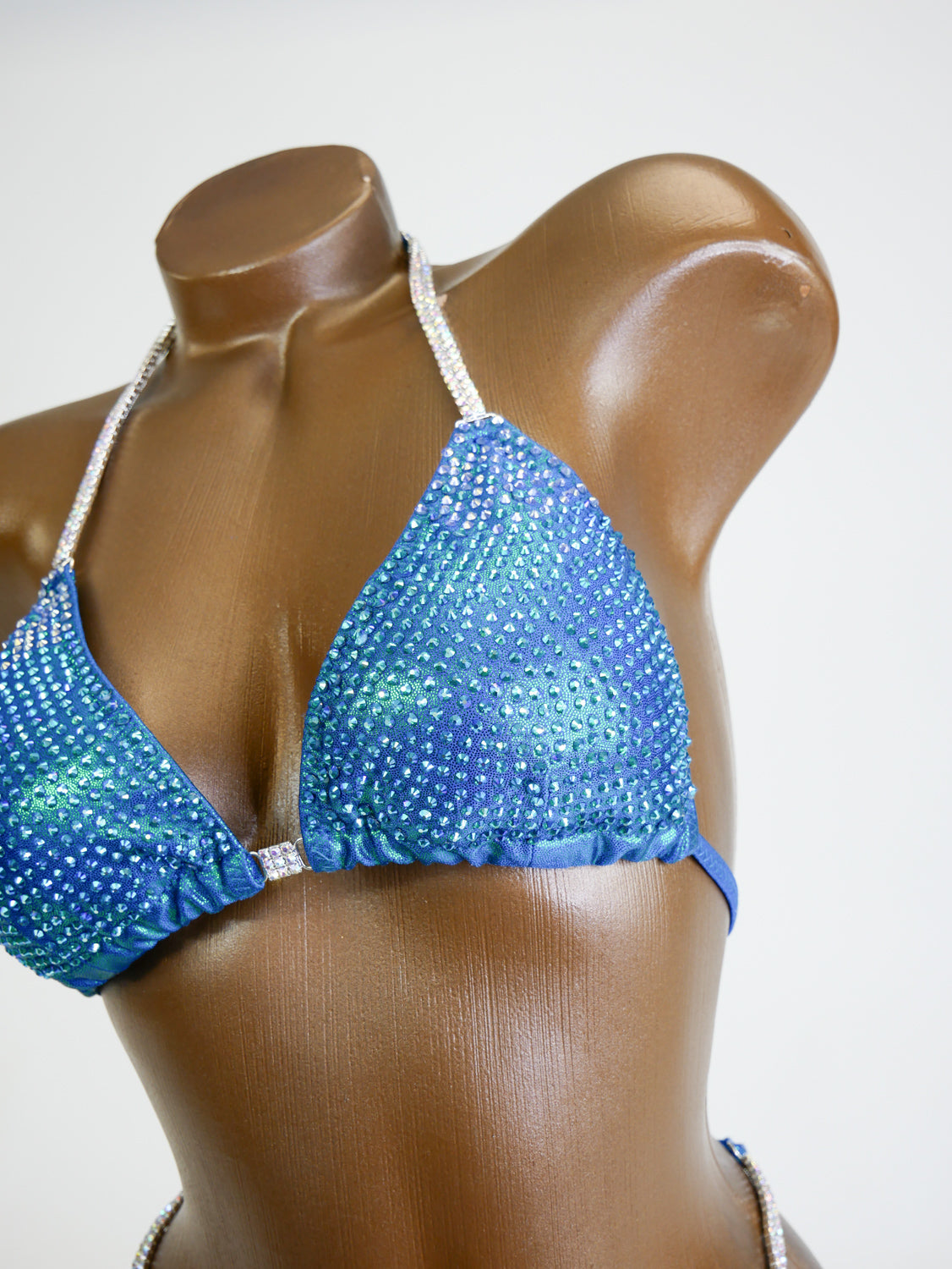 - Features: Double AB rhinestone connectors at bra and hips, decorated with peacock blue & sapphire AB rhinestones, scrunch back, Rio Pro cut back coverage