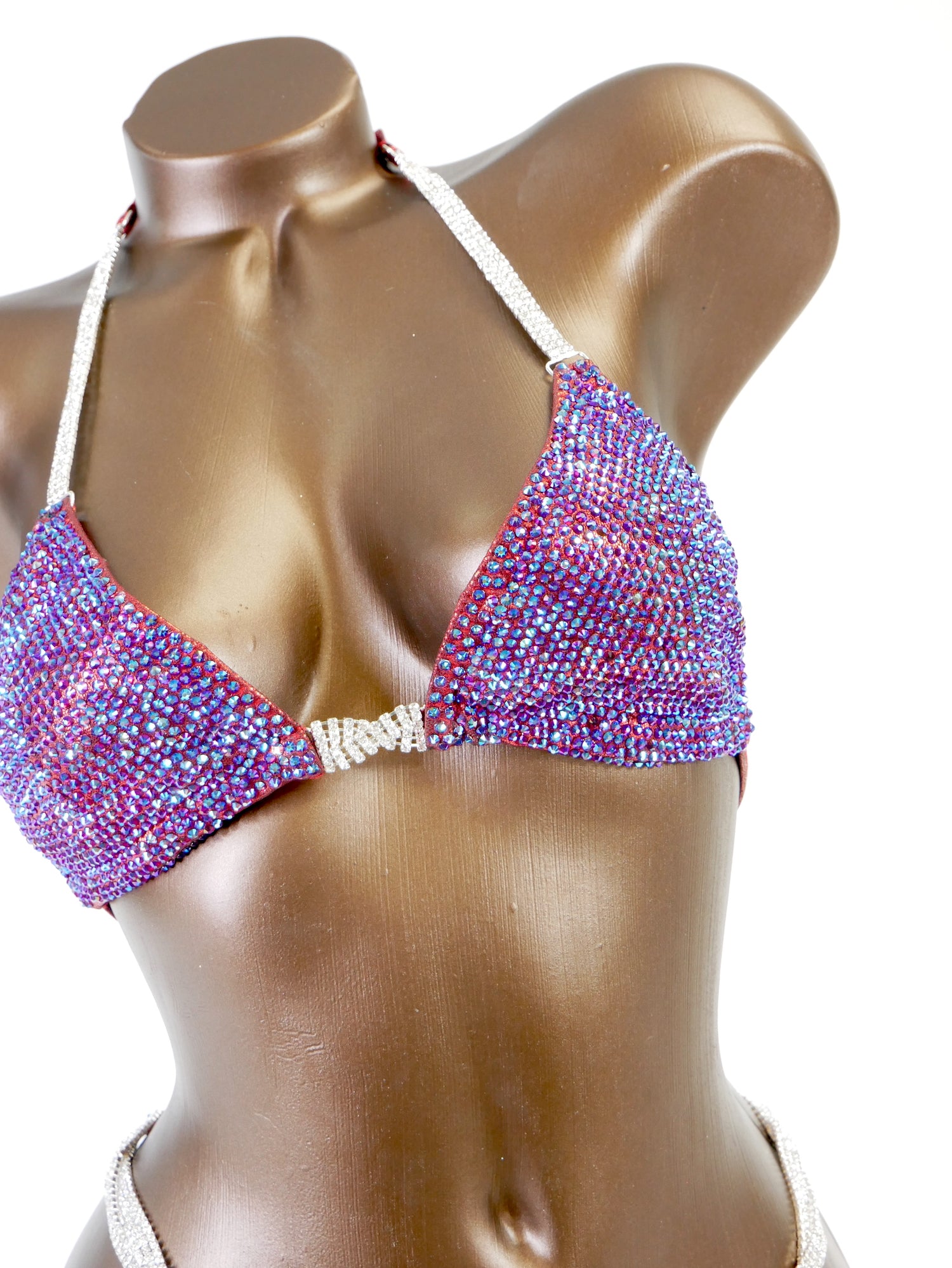 - Features: Double close up crystal clear rhinestone connectors at bra, Braided crystal clear connectors at hips, decorated with Siam AB rhinestones, scrunch back, Rio back coverage, fully lined