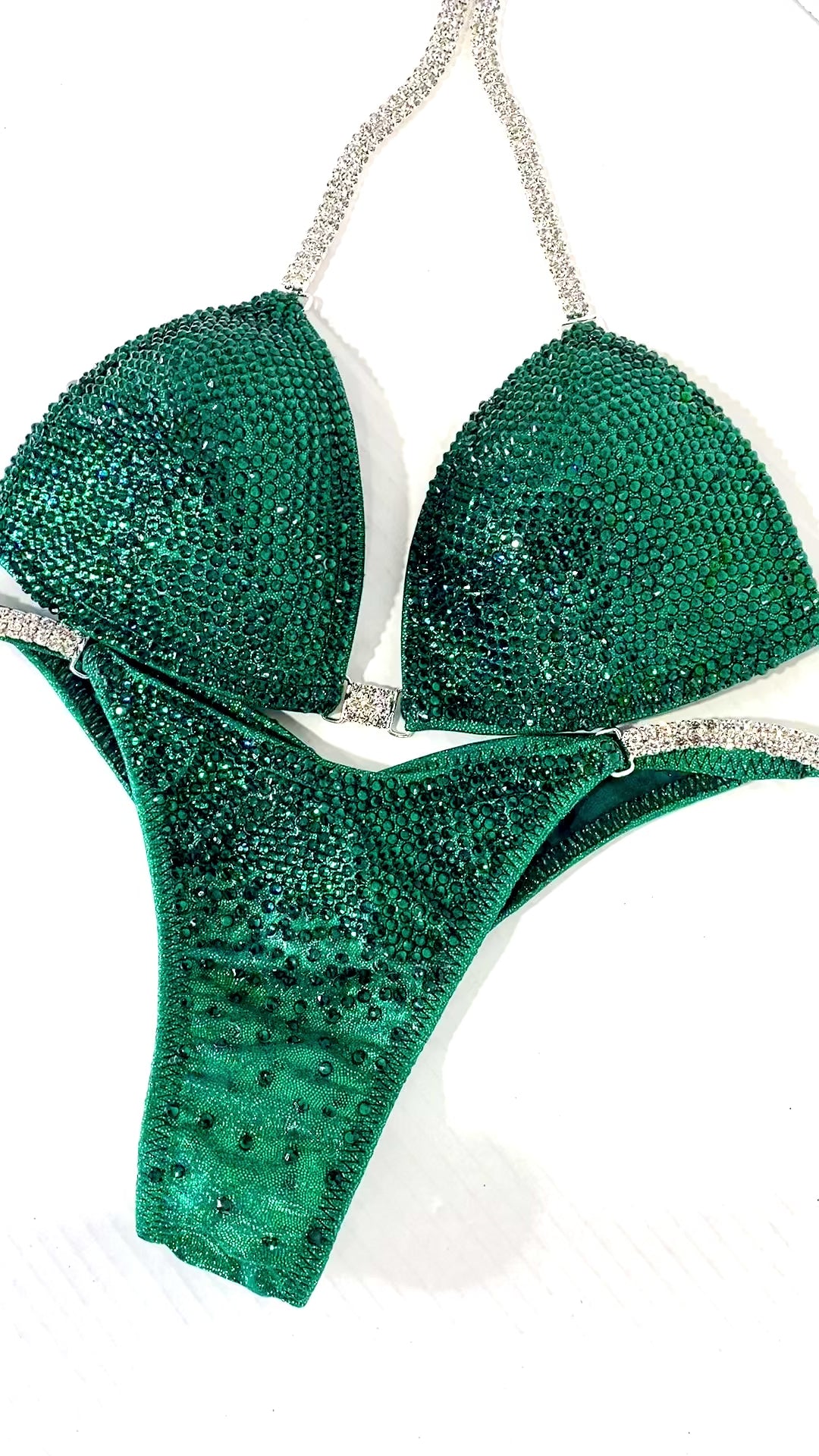 - Features: Double close up crystal clear rhinestone connectors at hips & bra, decorated with emerald rhinestones, scrunch back, Rio pro back coverage