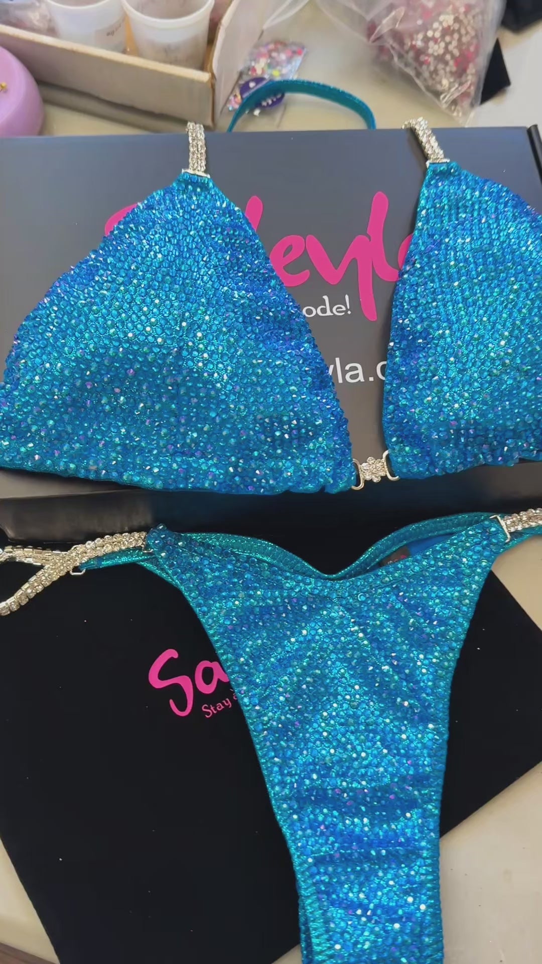 - Features: Double crystal AB rhinestone connectors at hips & bra, decorated with turquoise and turquoise AB rhinestones, scrunch back, moderate back coverage