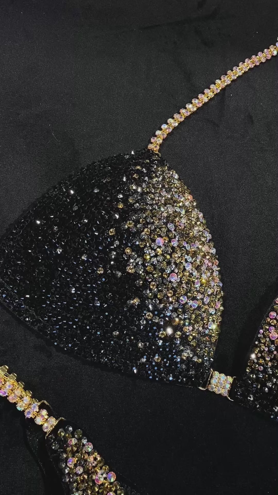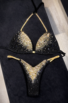 This custom-made competition bikini is designed for athletes competing in NPC, IFBB, WBFF, and OCB events. The Black Gold Gradient Wellness design is made to enhance your shape, sparkle under bright stage lighting, and fit perfectly to your measurements.