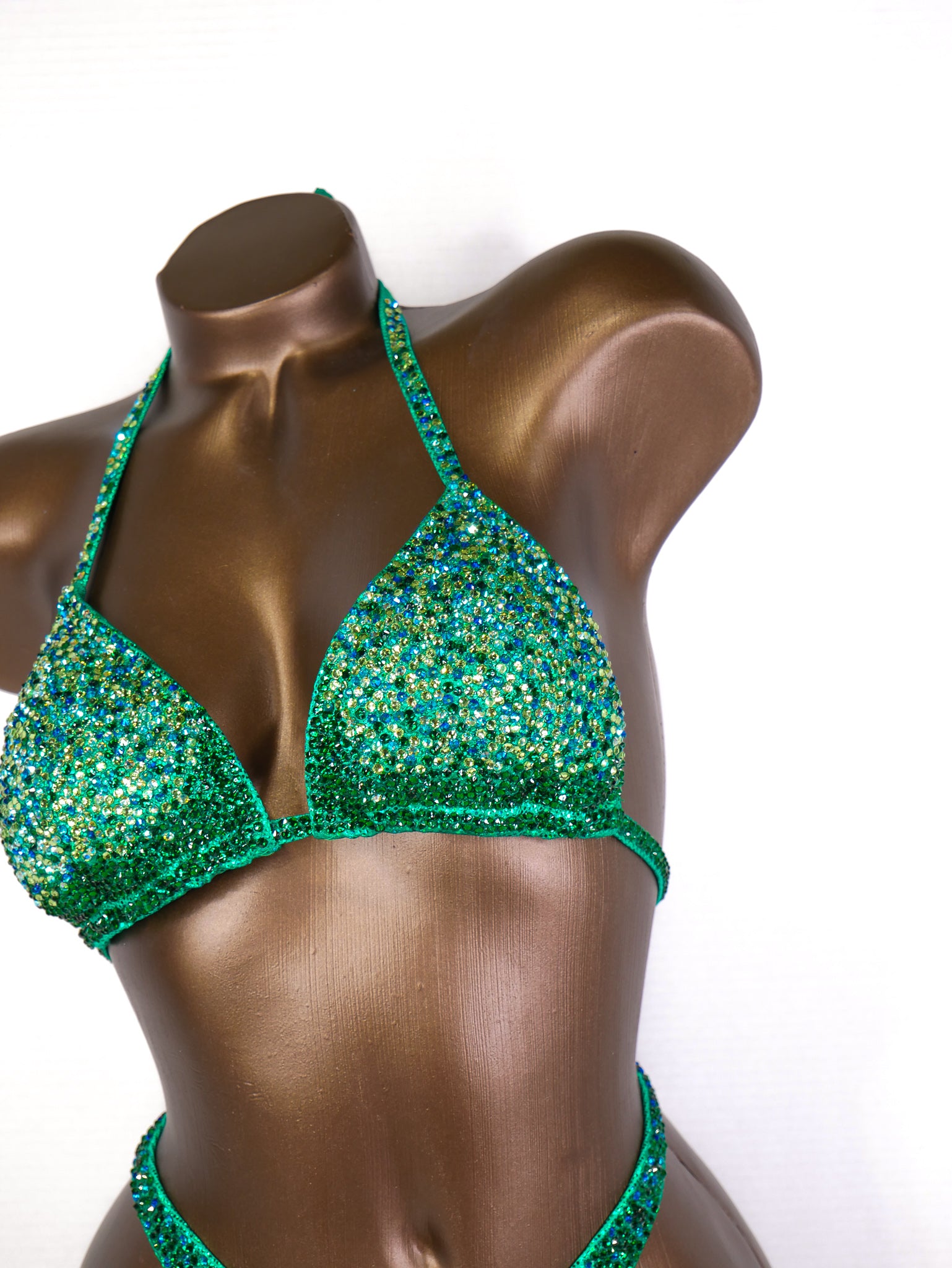 - Features: Decorated with light green, light green AB, emerald AB & emerald rhinestones, Rio Pro cut back coverage, fully lined