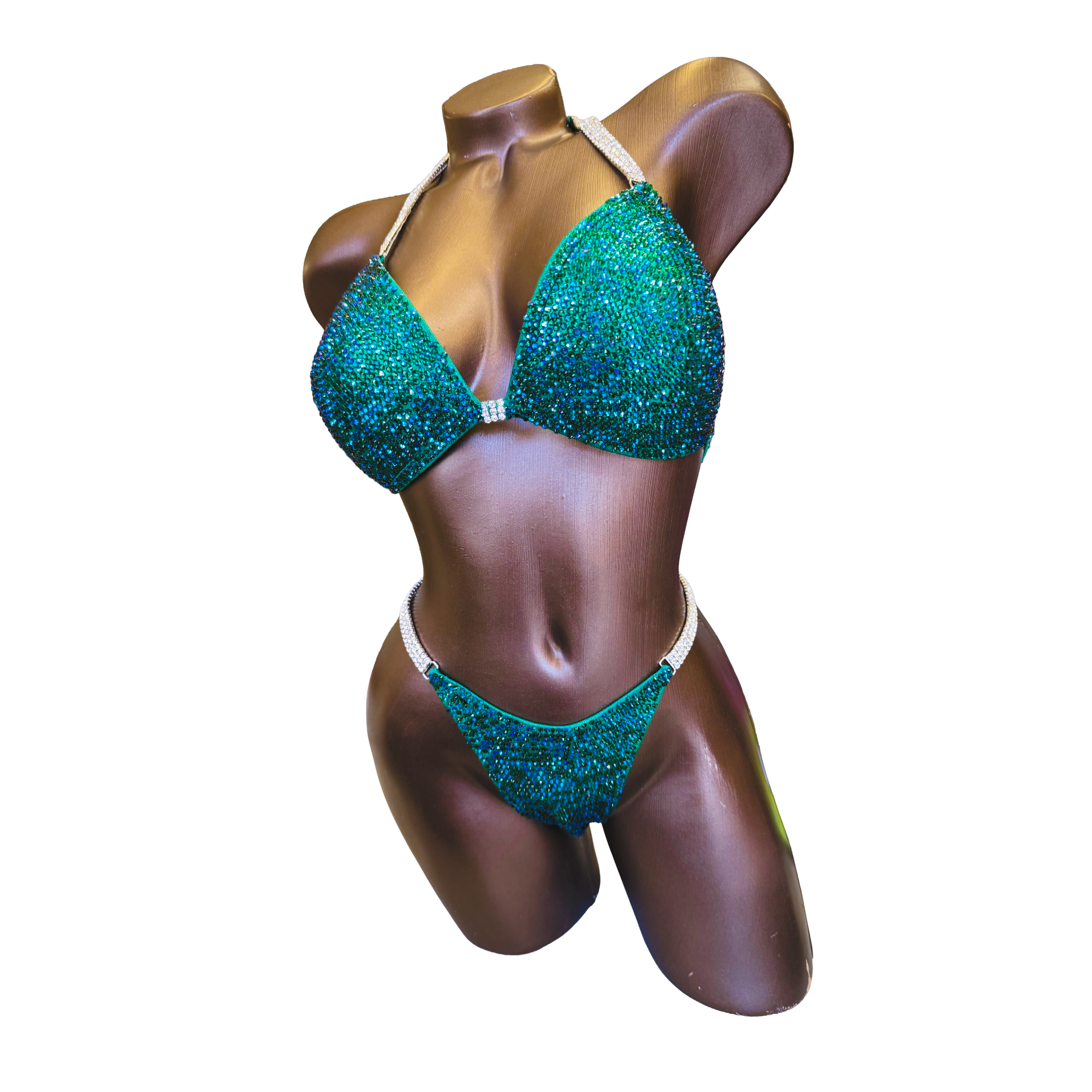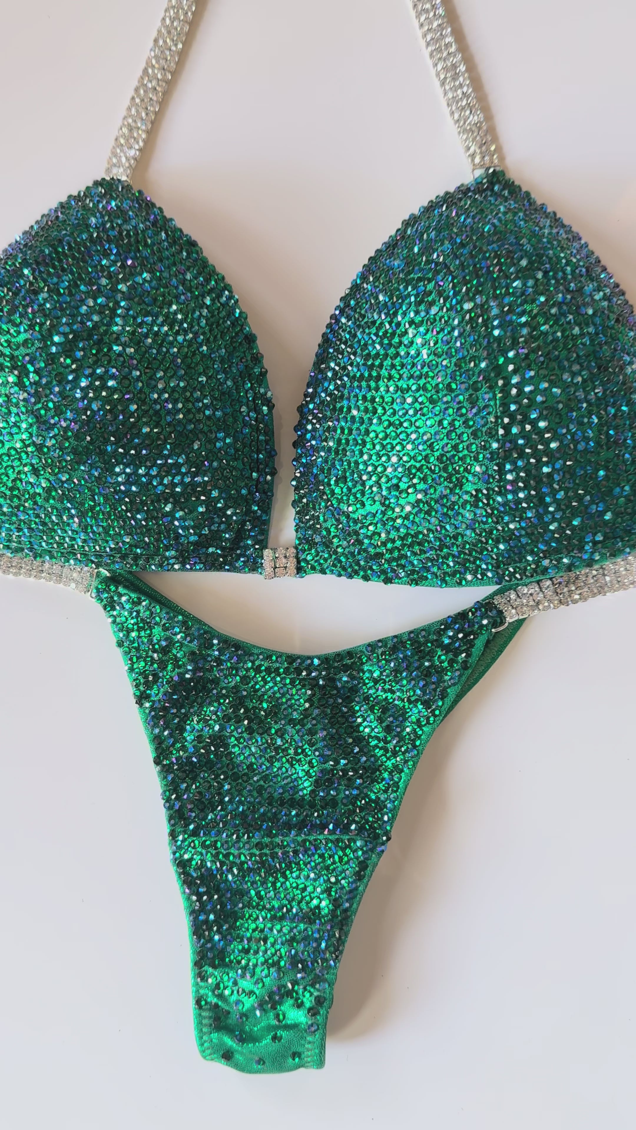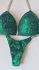 Shine bright on stage in our Emerald Metallic Competition Bikini, a bold ready-made suit designed to stand out under bright stage lighting. Made in green metallic spandex, this striking design is decorated with emerald and emerald AB rhinestones for a rich, high-impact sparkle.