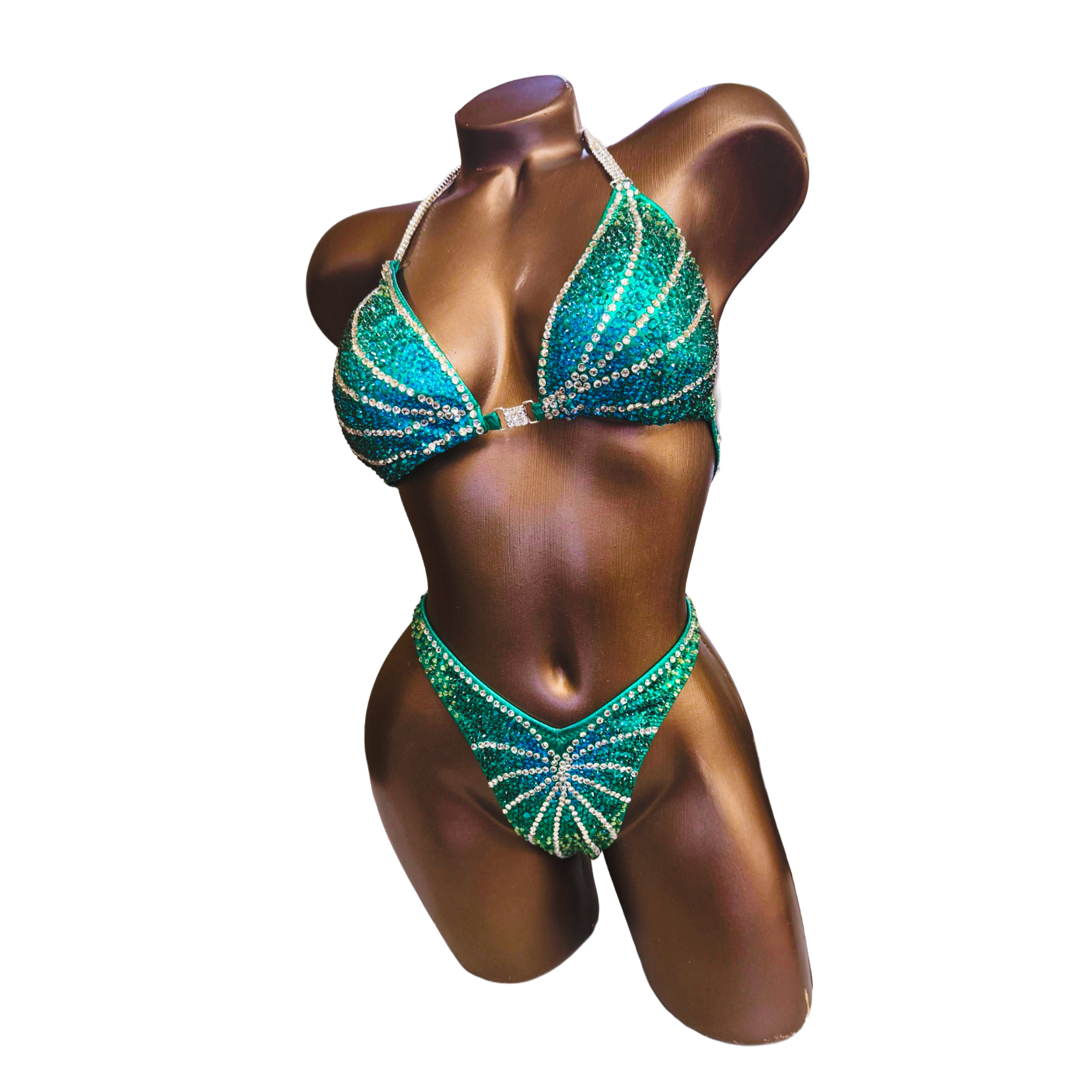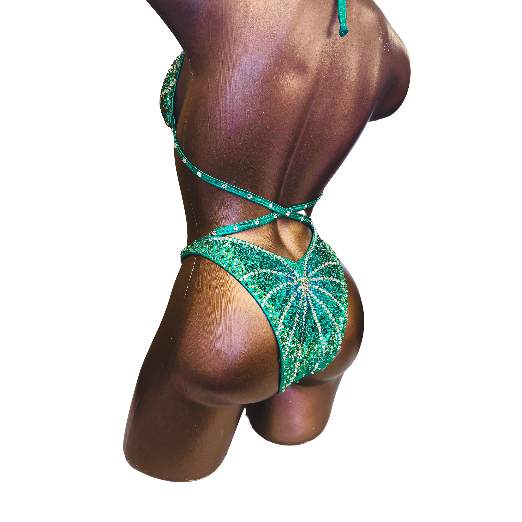 Perfect for figure competitors looking for a bold green suit with timeless sparkle and a professional stage look.