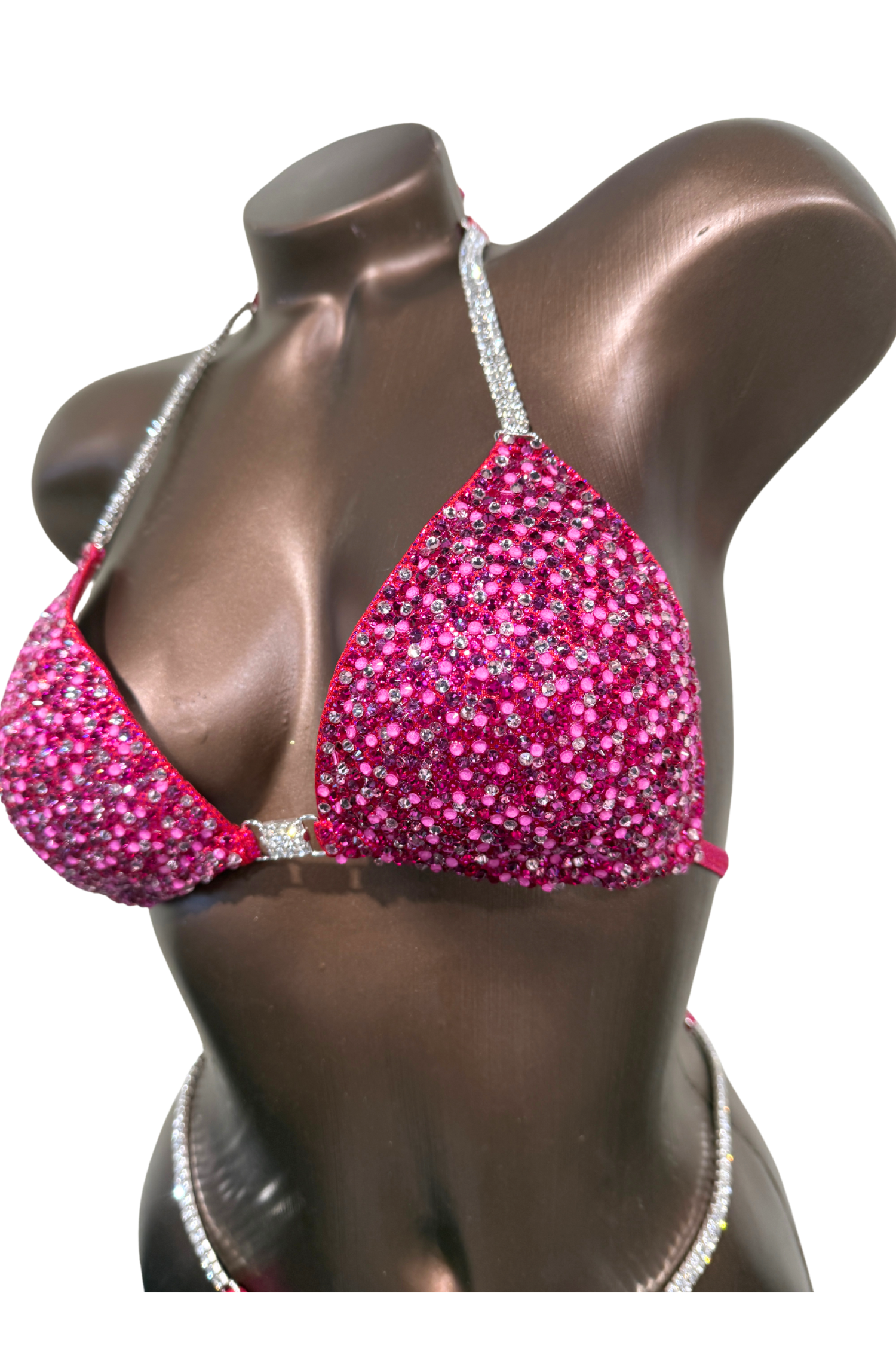 Neon Pink Crystal Bikini Suit / Handmade Competition Bikini with Fuchsia & Light Rose Stones