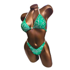 Perfect for figure competitors looking for a bold green suit with timeless sparkle and a professional stage look.