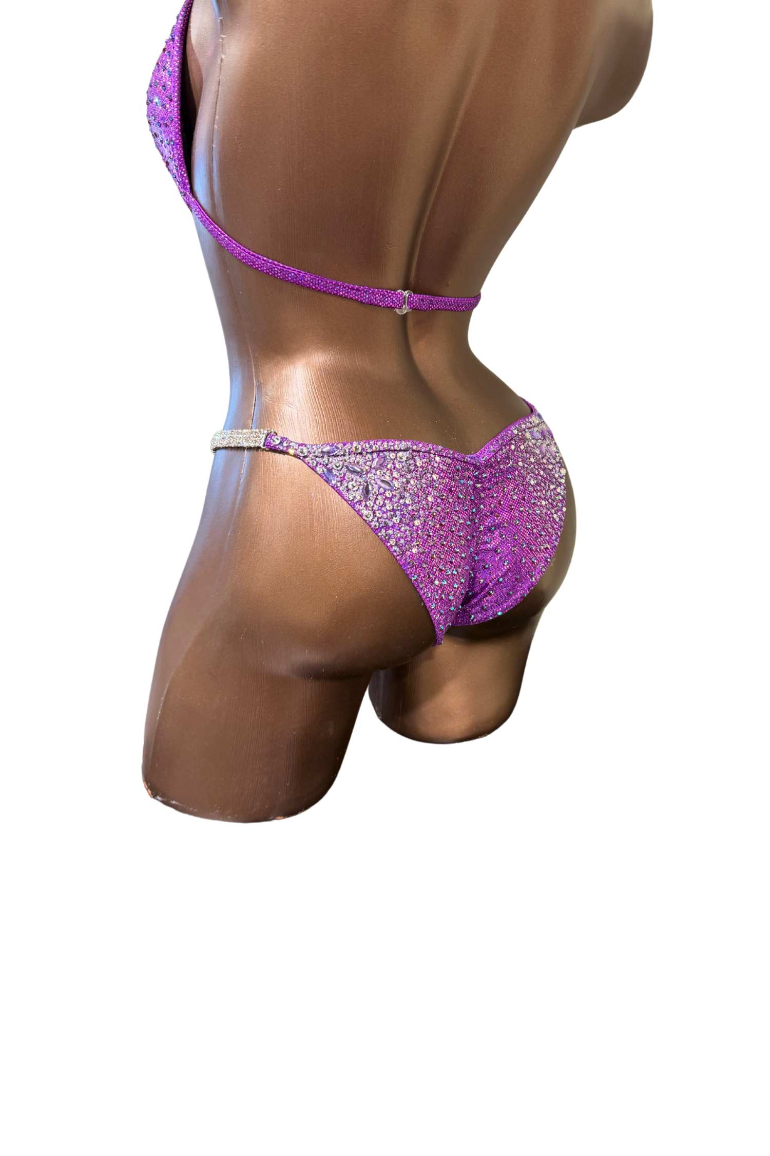 - Features: Triple crystal clear rhinestone connectors at hips & bra, decorated with crystal clear, light purple & siam AB rhinestones, sparkling glitter detail, scrunch back, moderate back coverage
