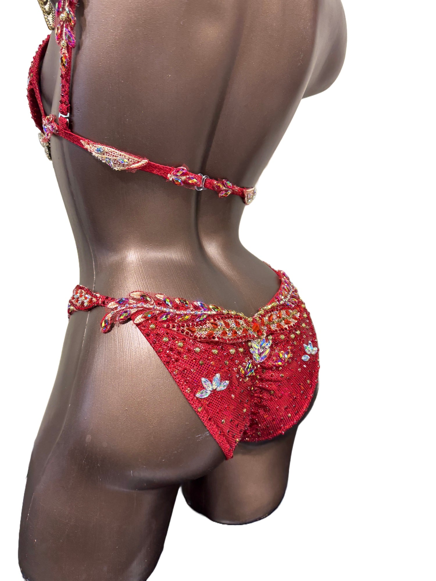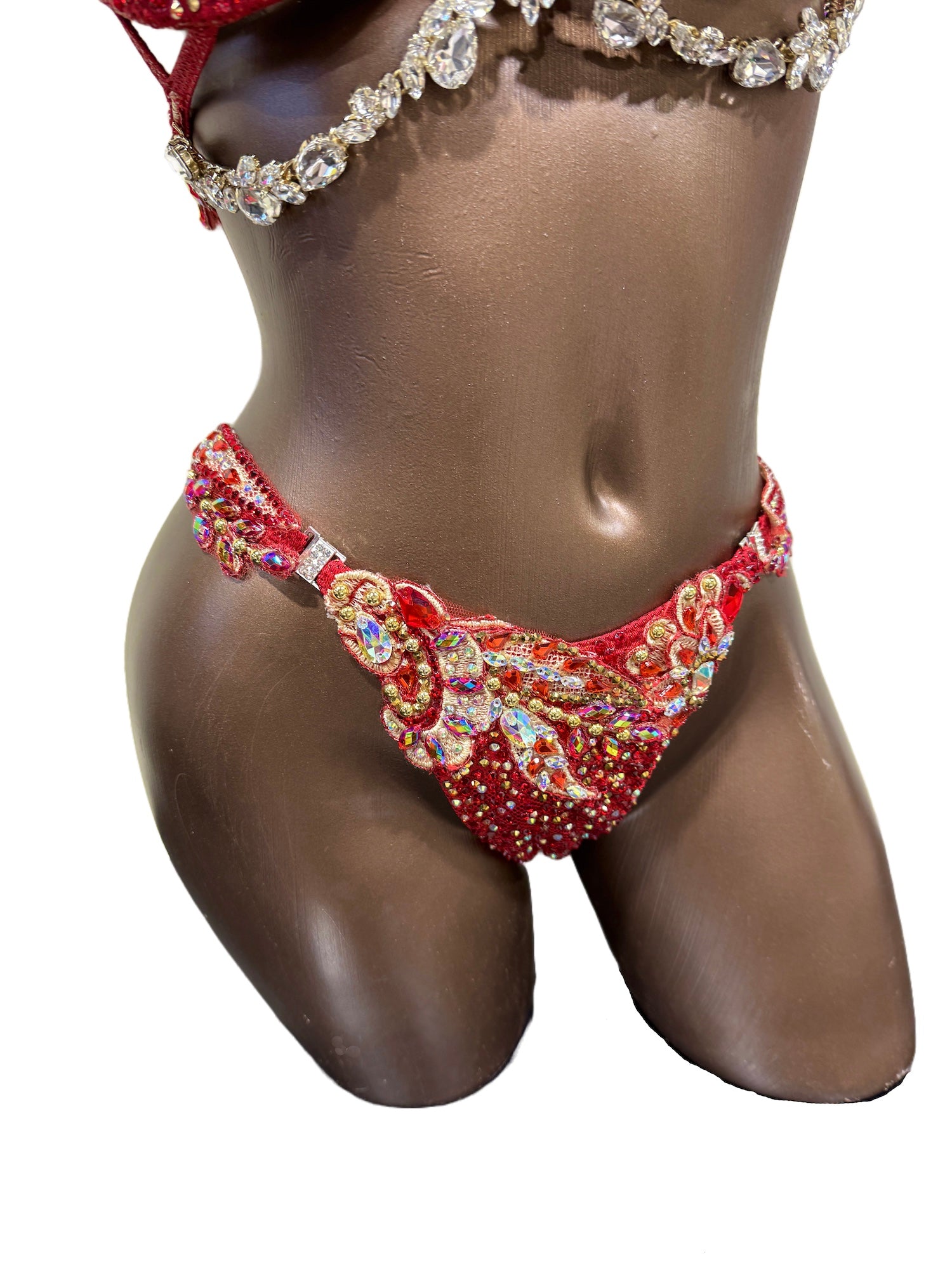 - Features: Lace connectors at hips, Decorated with red, red AB, gold, gold pearls, and crystal AB rhinestones, sparkling glitter detail, scrunch back, moderate back coverage