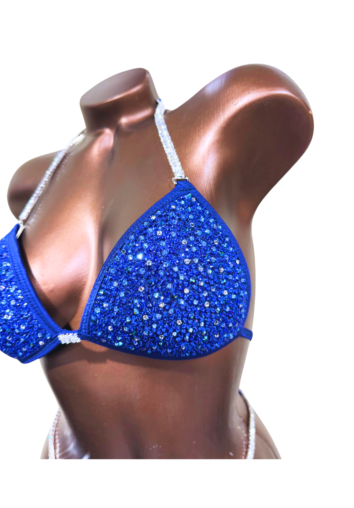 - Features: Double crystal clear rhinestone connectors at hips & bra, decorated with sapphire, crystal clear, jet AB & light sapphire AB rhinestones, sparkling glitter detail, scrunch back, Rio Pro back coverage, fully lined