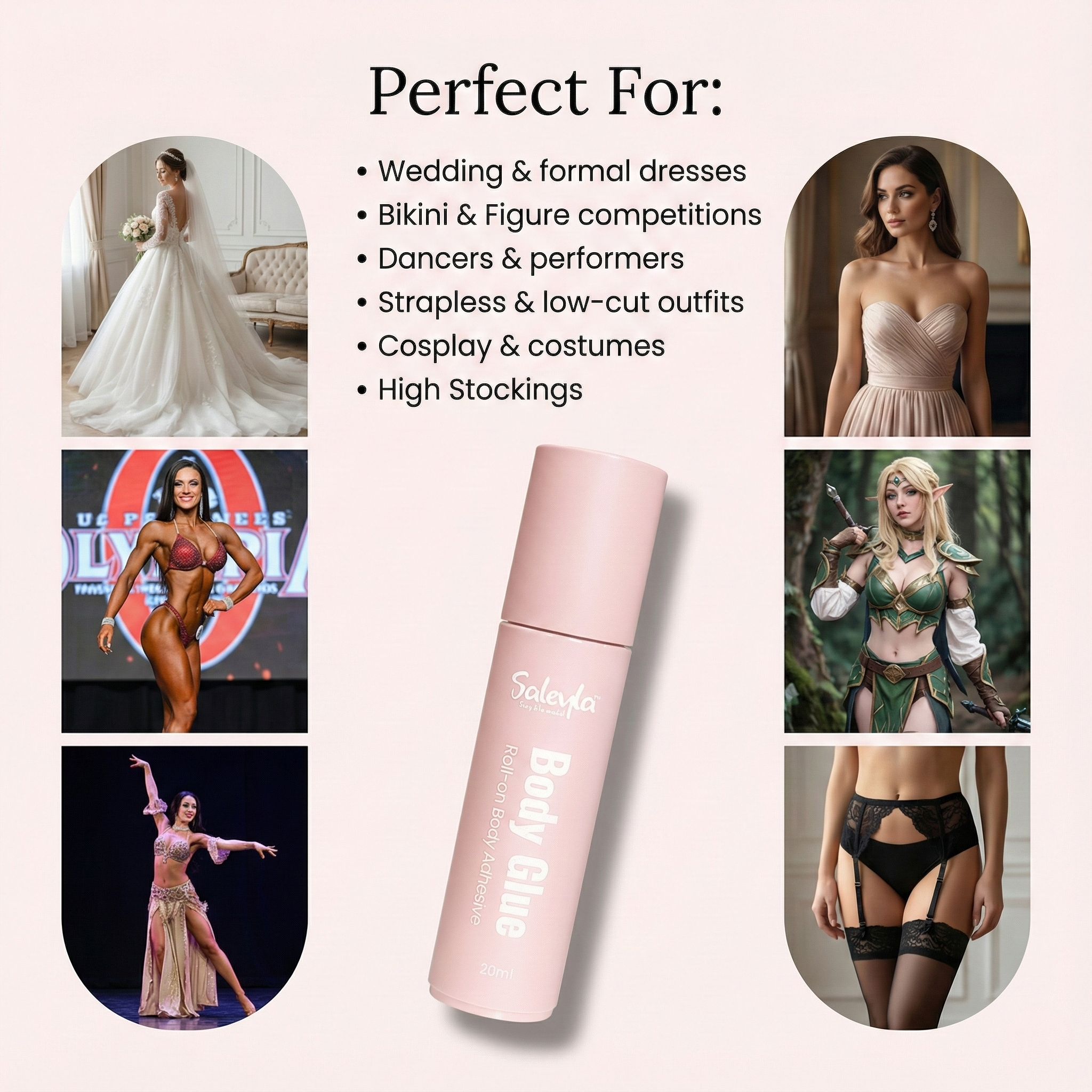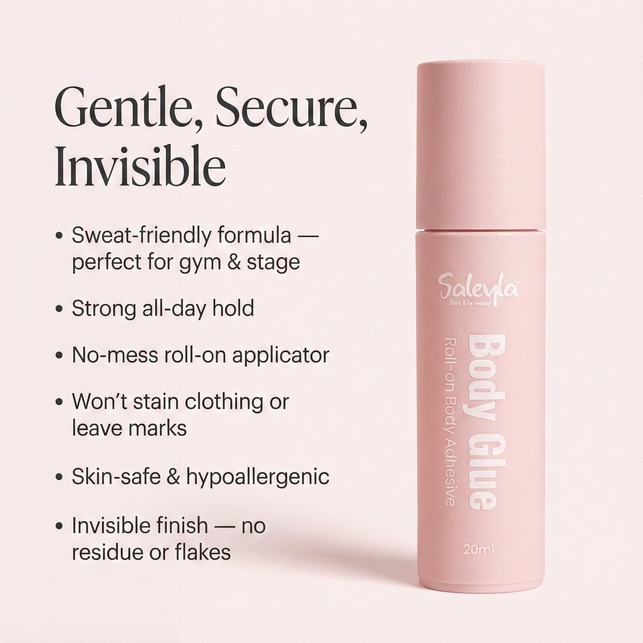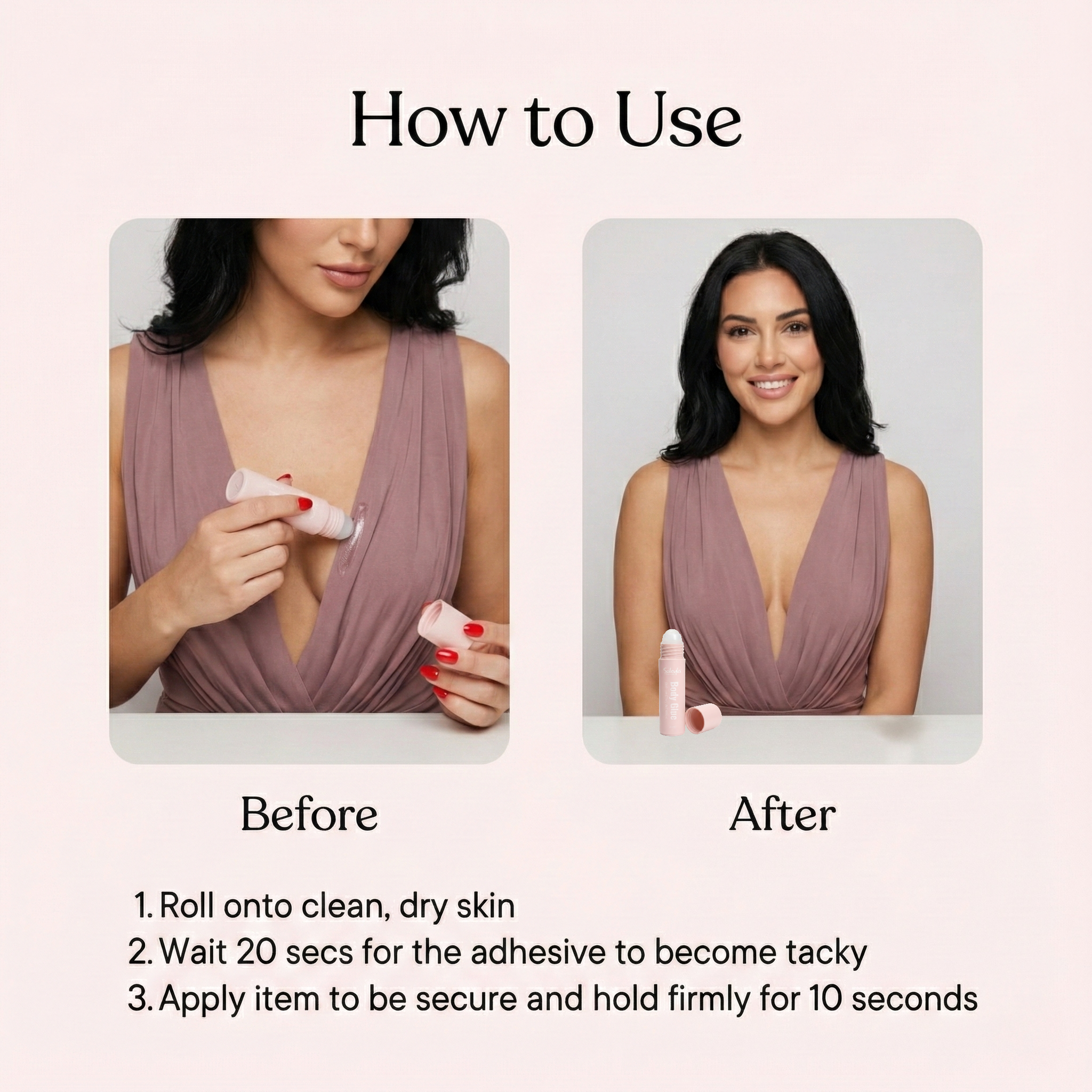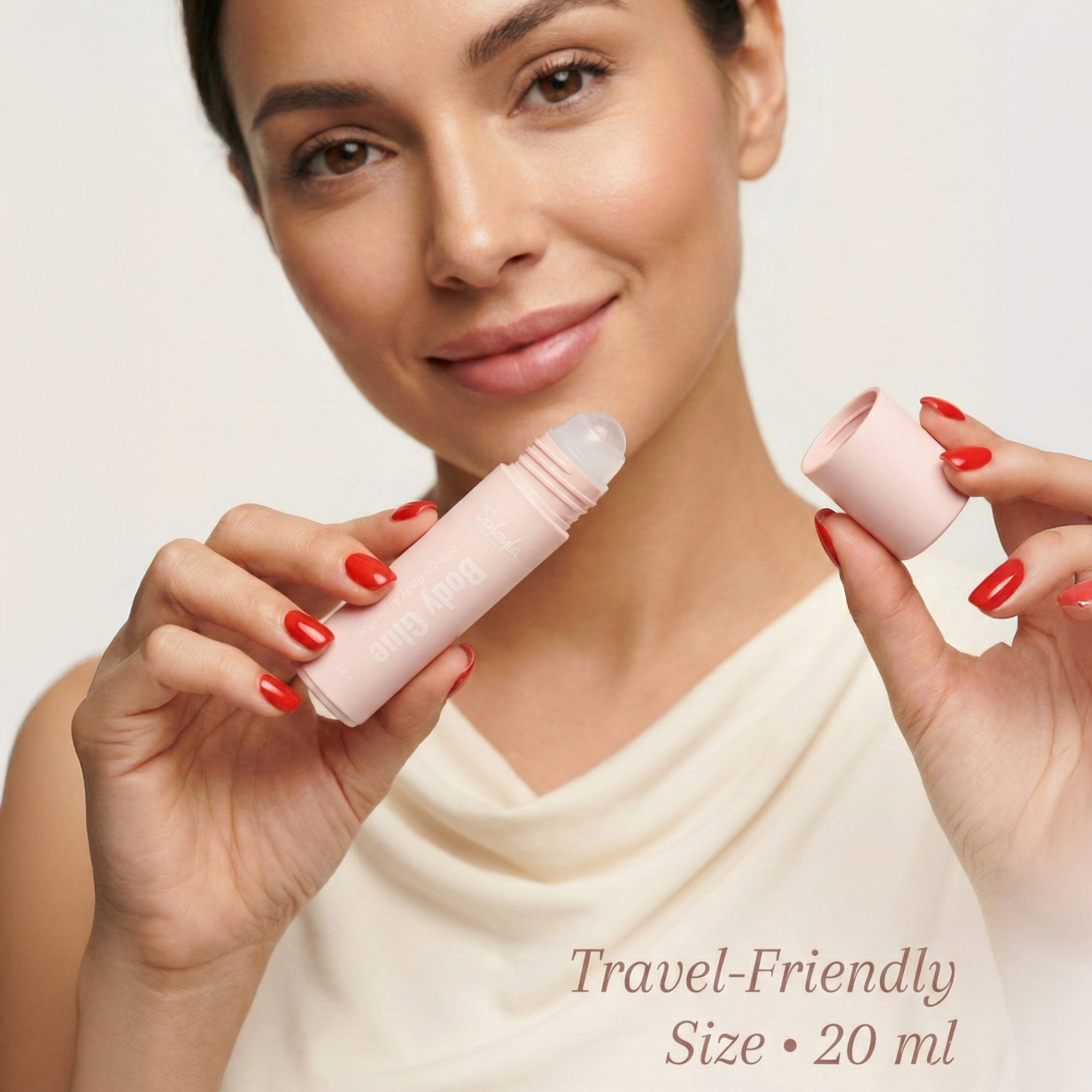 Easy, mess-free roll-on application that dries clear and washes off easily. Latex-free and gentle on sensitive skin. Perfect for stage, photoshoots, and everyday fashion.