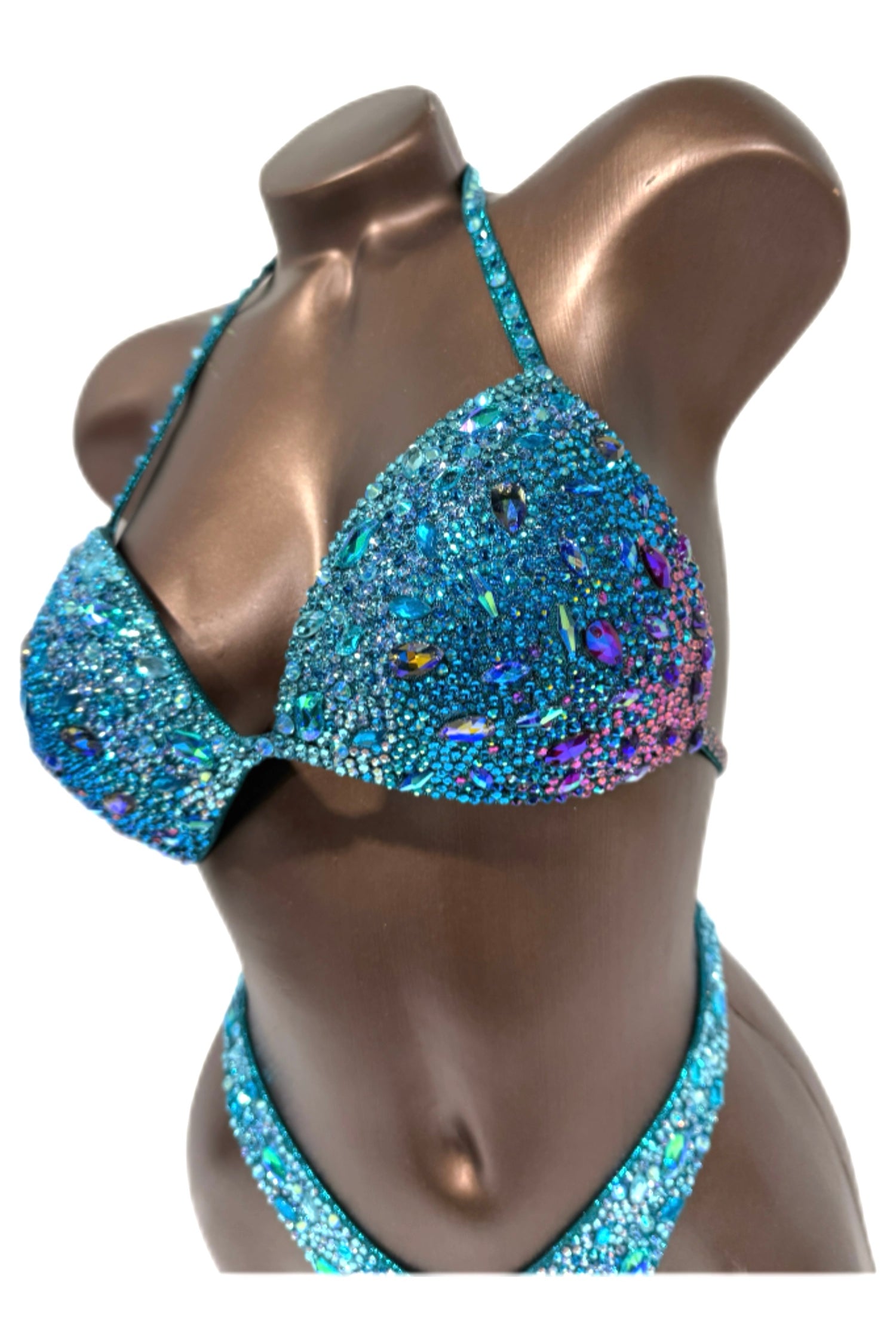 This custom-made competition bikini is designed for athletes competing in NPC, IFBB, WBFF, and OCB events. The Teal Gradient design is made to enhance your shape, sparkle under bright stage lighting, and fit perfectly to your measurements.