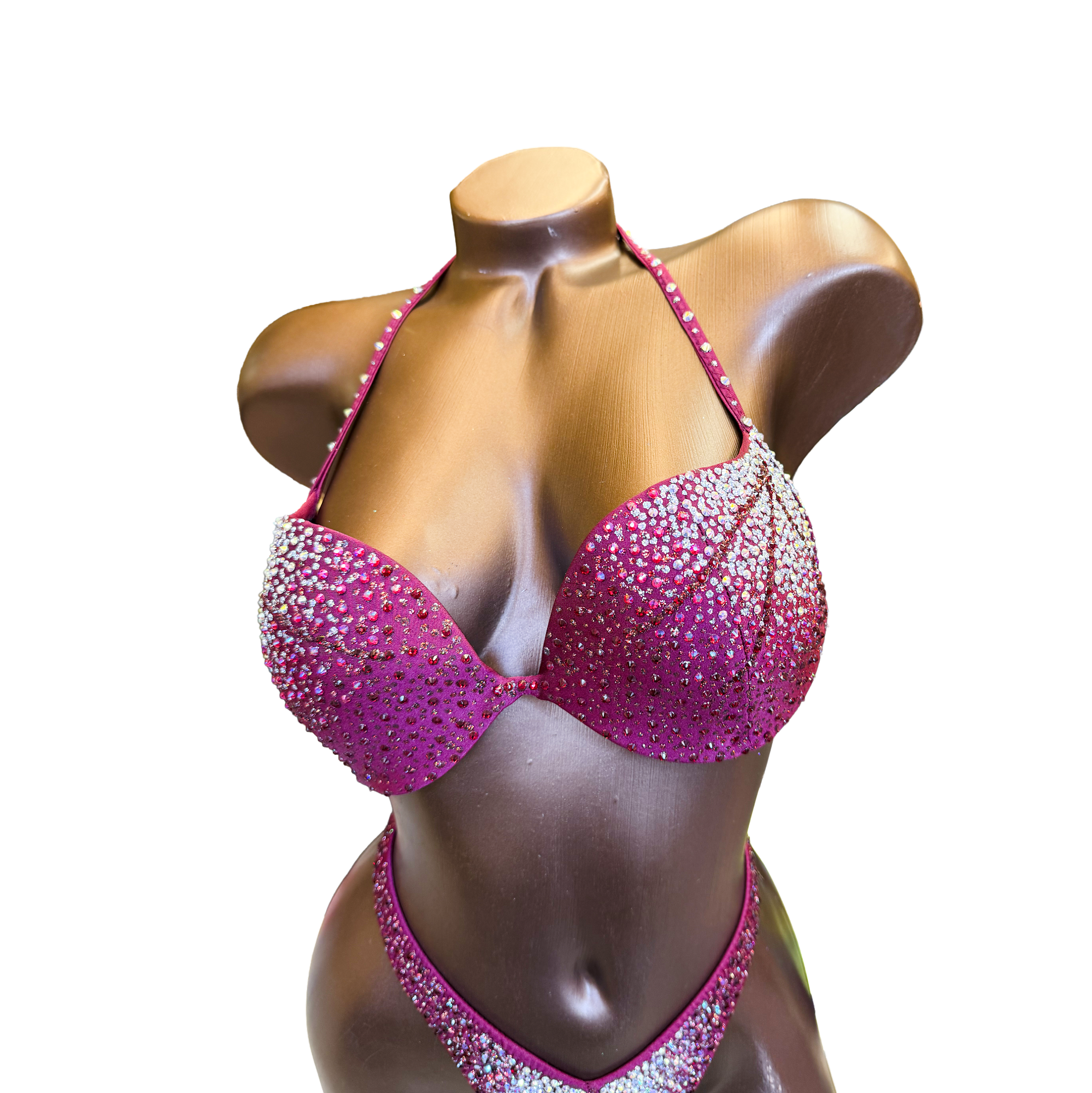 Command attention on stage in our Burgundy Iridescent Figure Competition Suit, a rich ready-made design created to glow beautifully under bright stage lighting. Made in burgundy satin spandex and decorated with Crystal AB, Fuchsia AB, and deep red rhinestones, this suit delivers a deep, radiant sparkle with an elegant competition finish.
