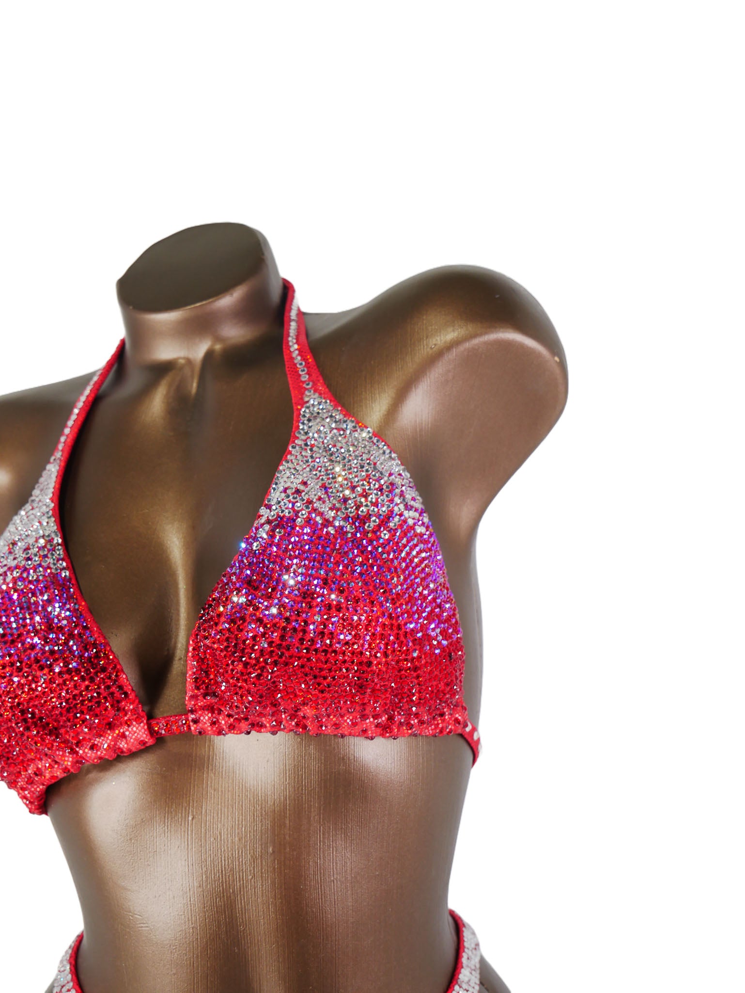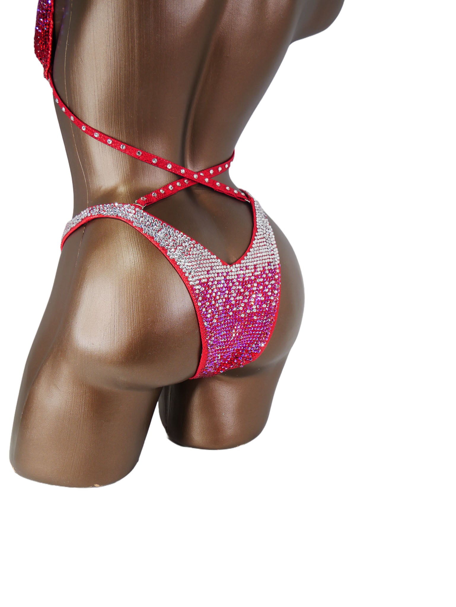 - Features: Decorated with crystal clear, fuchsia AB, and red rhinestones, Rio back coverage, fully lined