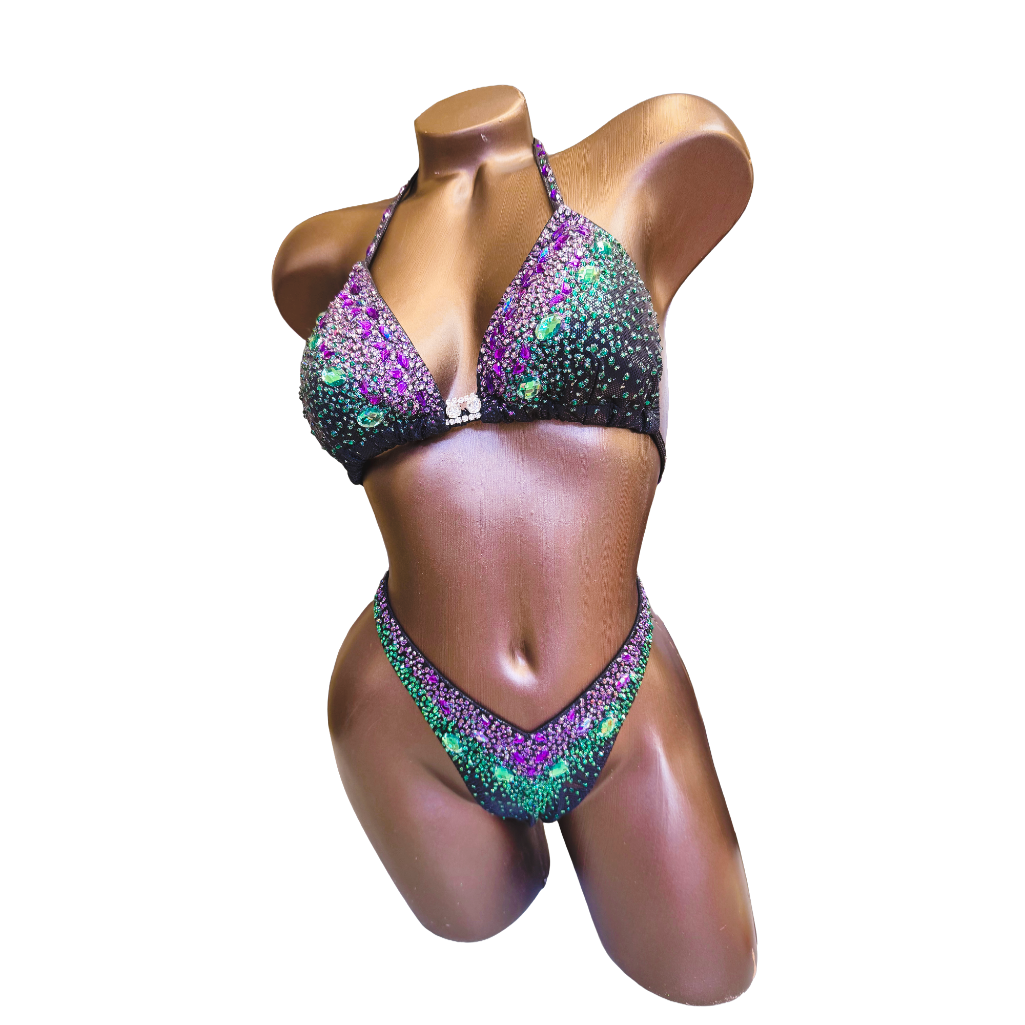 This ready made green purple gradient design figure competition suit is designed to shine under stage lights with bold color, clean lines, and brilliant sparkle. Crafted from premium black metallic dots spandex, this suit reflects light beautifully, creating a striking, eye-catching stage presence.
