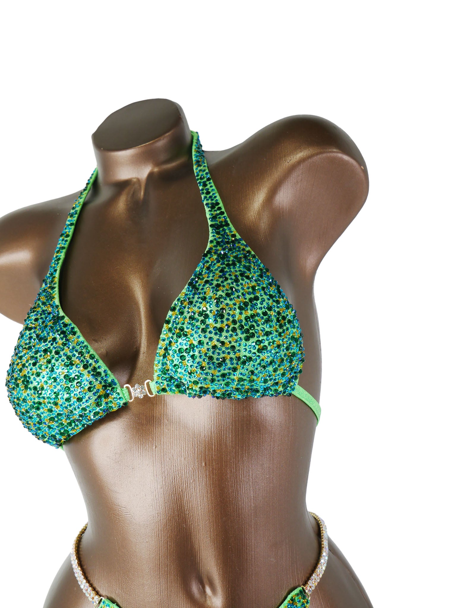 - Features: Double close up gold AB rhinestone connectors at hips, decorated with emerald, light sapphire and capri blue rhinestones, sparkling glitter detail, rio back coverage, fully lined
