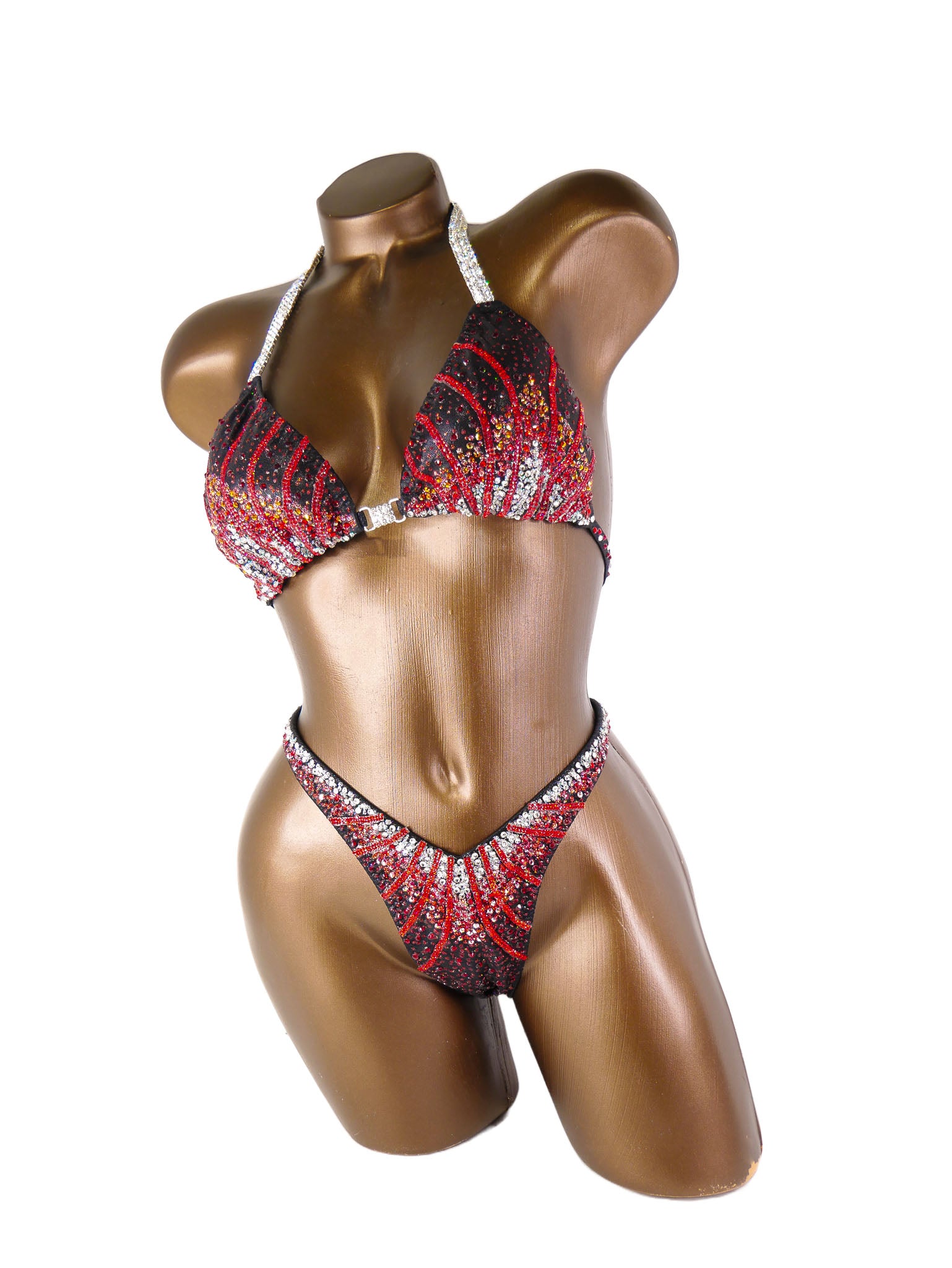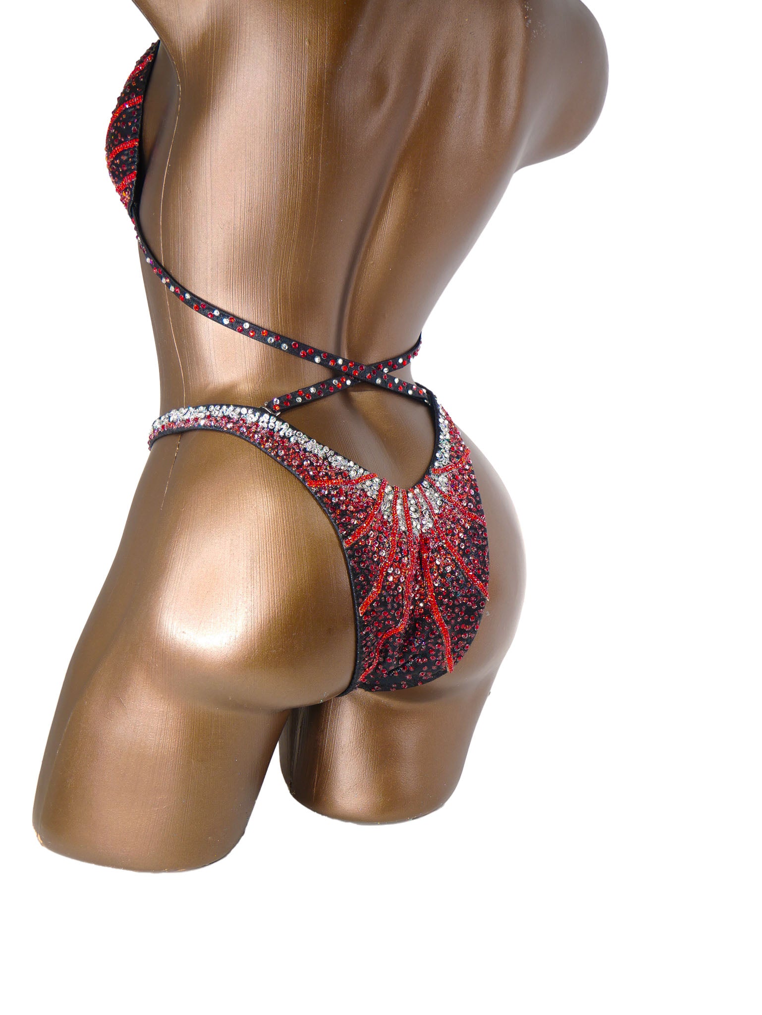 - Features: Triple crystal clear rhinestone connector at bra, decorated with crystal clear, red, red AB & deep red rhinestones, sparkling glitter detail, rio back coverage, fully lined