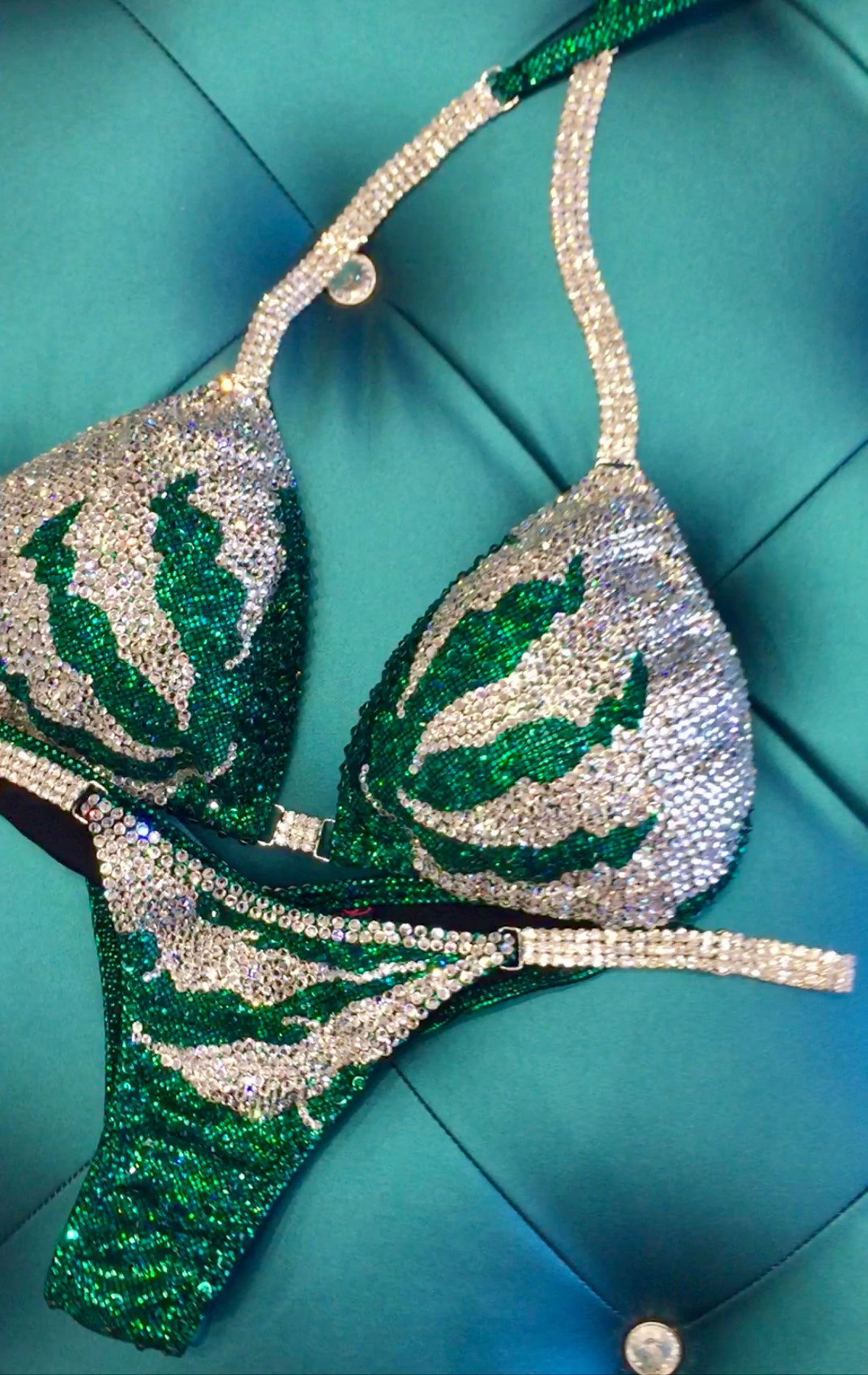- Dazzling Details: The suit is a treasure of sparkle, featuring triple crystal clear rhinestone connectors that cascade at the bra and hips. It's lavishly decorated with crystal clear and emerald rhinestones, emulating the precious stones found in nature's depths.