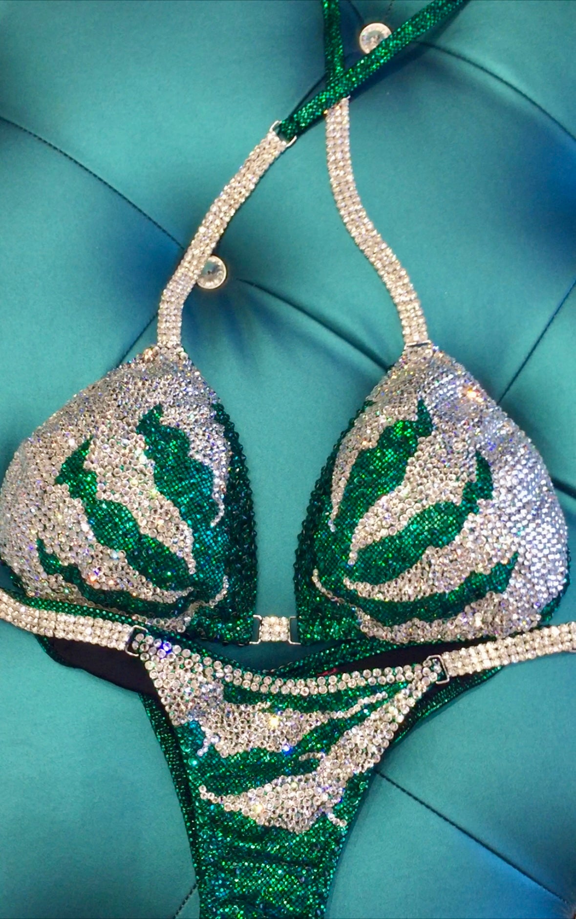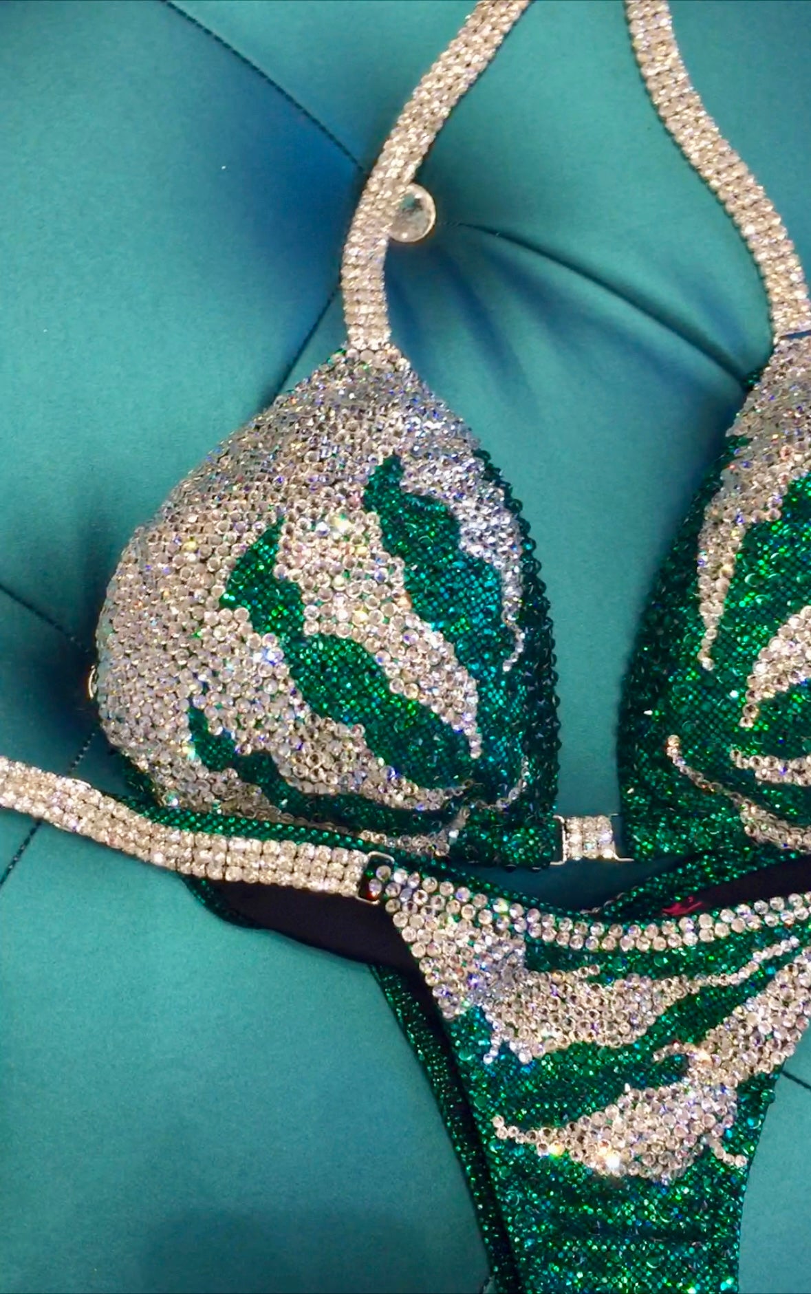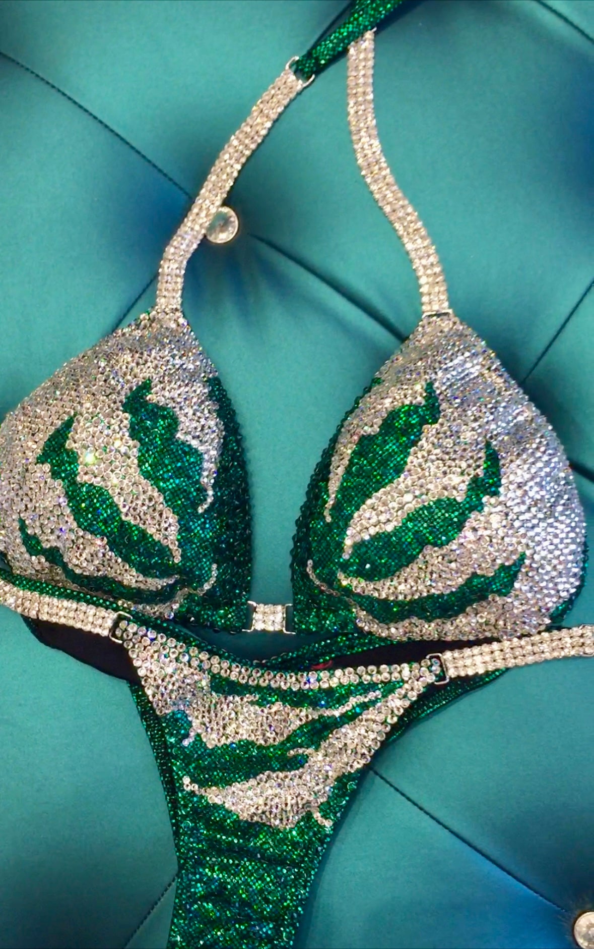 Captivate the judges and audience with our Green Gala Competition Bikini. Exquisitely designed for the competitor who demands the spotlight, this bikini combines luxury with performance. Perfect for NPC, IFBB, WBFF, OCB, or Muscle and Fitness Contests.