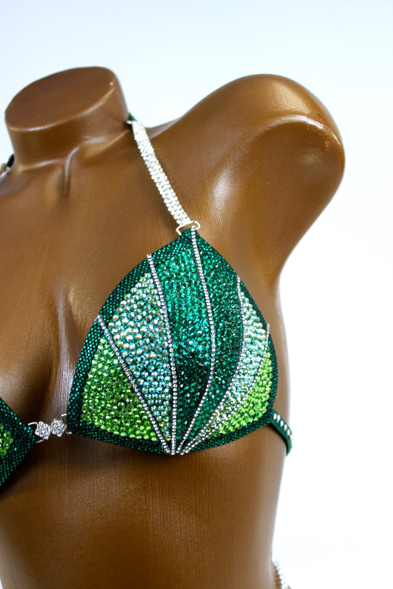 - Features: Double crystal clear rhinestone connector at bra, triple connectors at hips, decorated with crystal clear, light green, peridot AB & emerald rhinestones, rio back coverage, fully lined