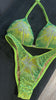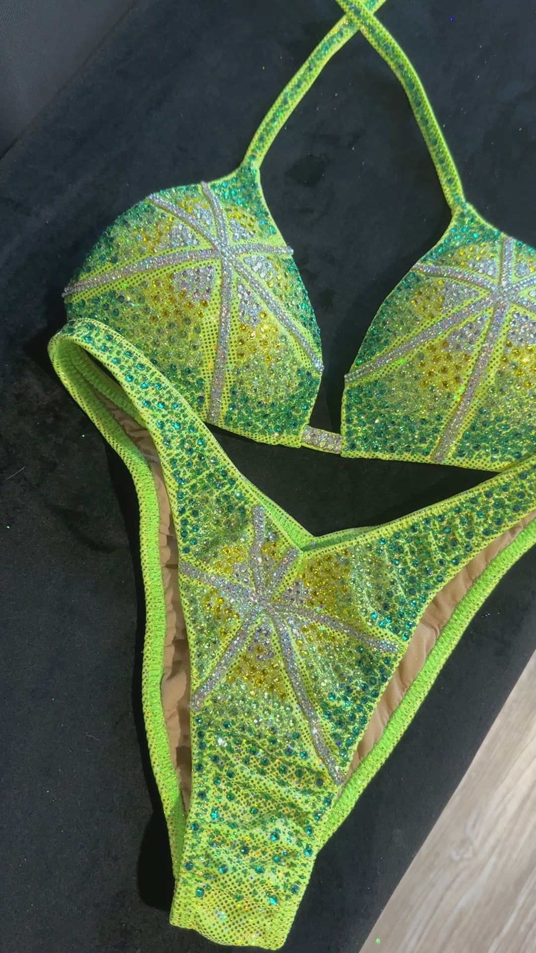 - Features: Double close up crystal AB rhinestone connector at center bra, decorated with crystal AB, crystal clear, yellow, light green & emerald rhinestones, sparkling glitter detail, rio back coverage, fully lined
