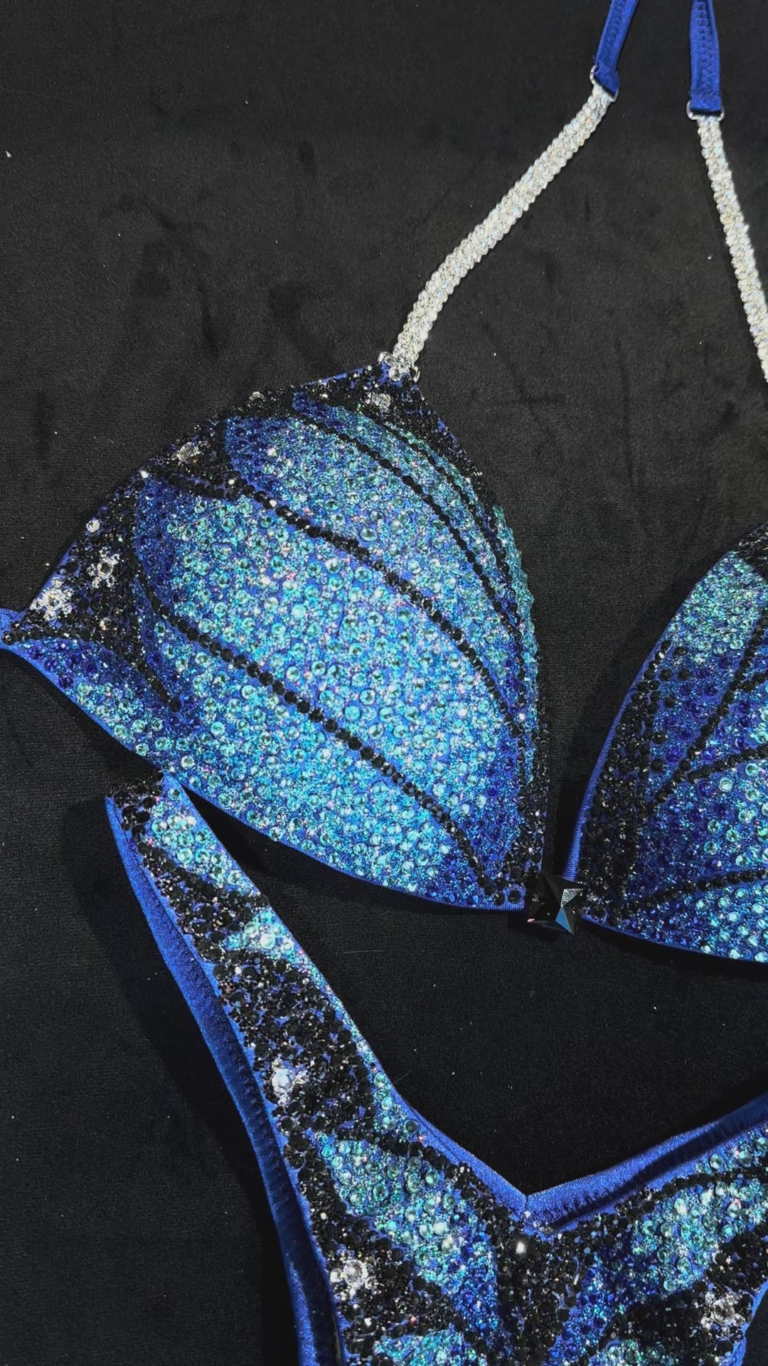 - Features: Double close up crystal clear rhinestone connector at bra, decorated with crystal clear, black, sapphire, bermuda blue & light turquoise rhinestones, sparkling glitter detail, moderate back coverage, fully lined