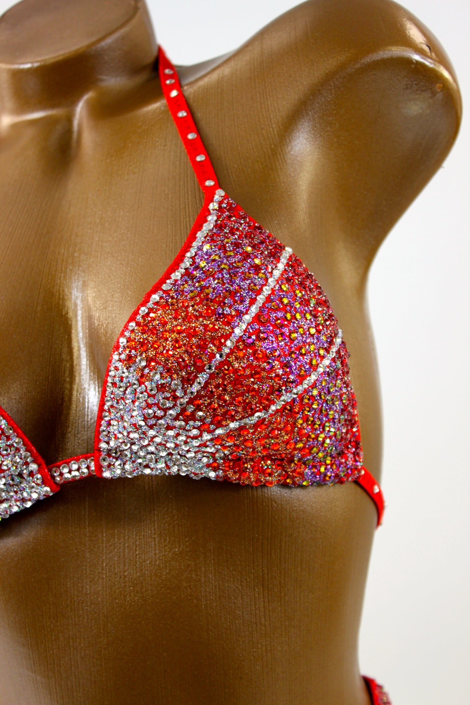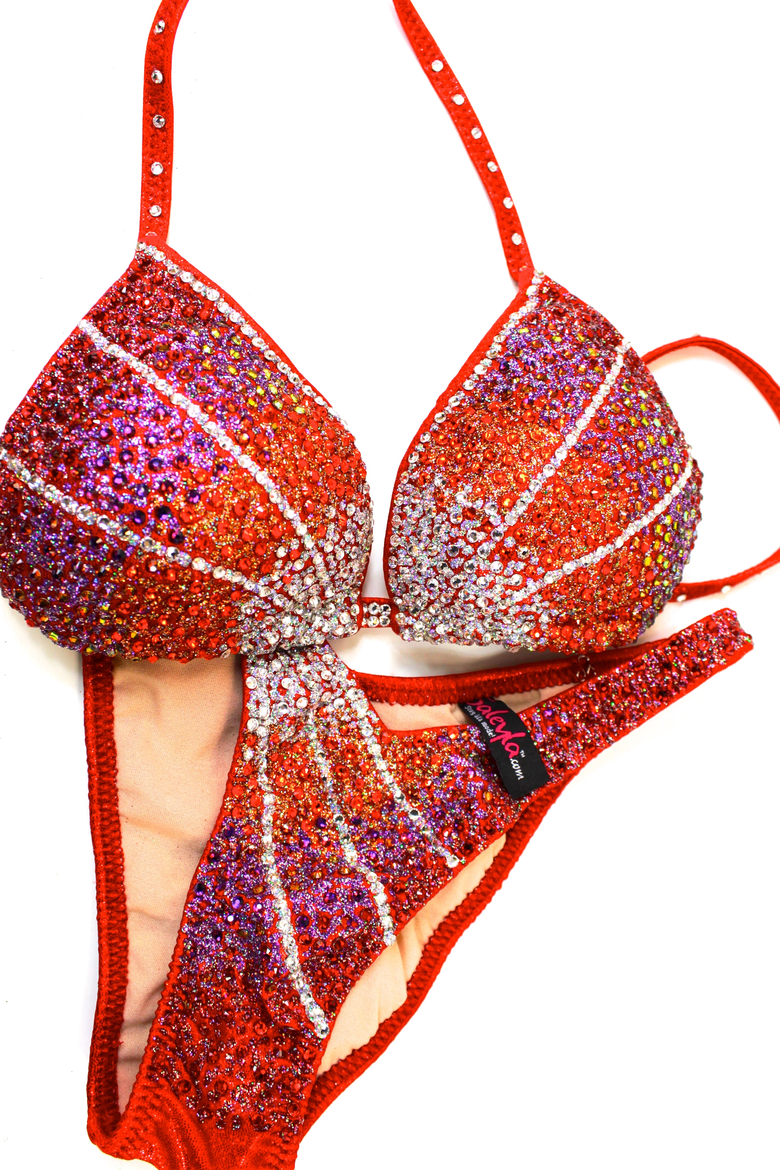 - Features: Decorated with crystal clear, orange, volcano & red rhinestones, sparkling glitter detail, moderate back coverage, fully lined