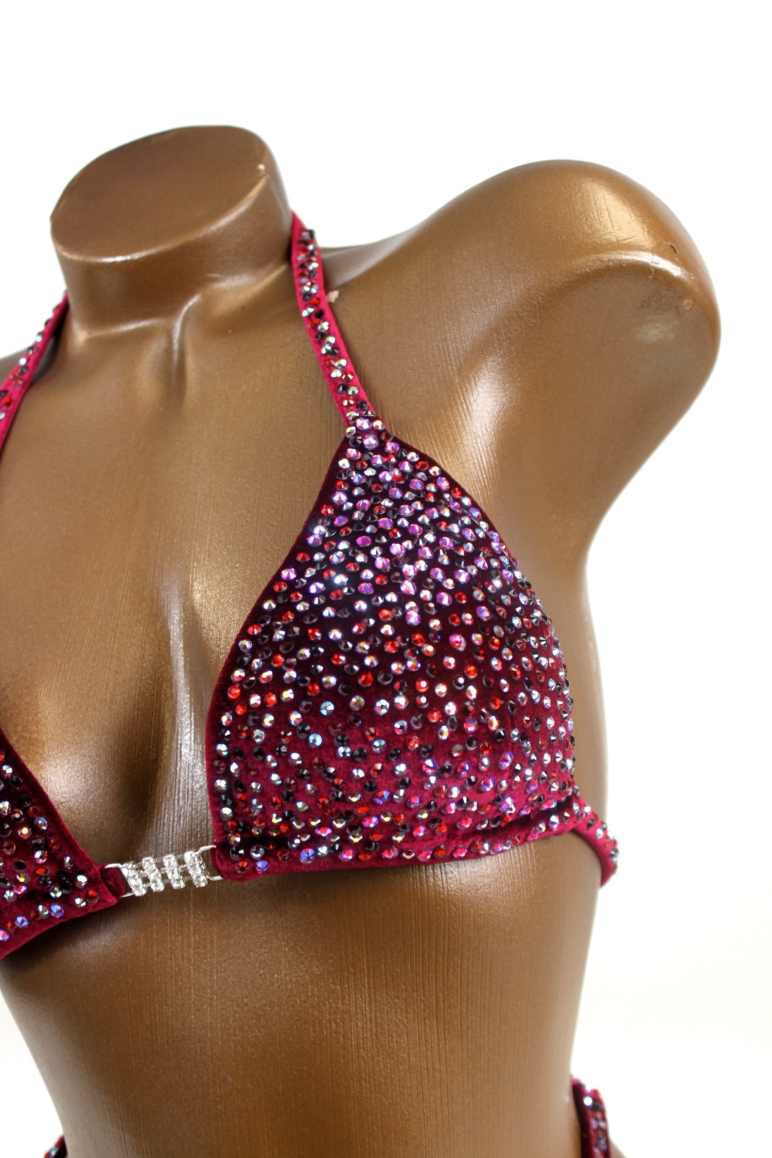 - Features: Triple rhinestone connector at center bra, decorated with fuchsia shimmer AB, red, red AB & deep red rhinestones, pro cut rio back coverage, fully lined