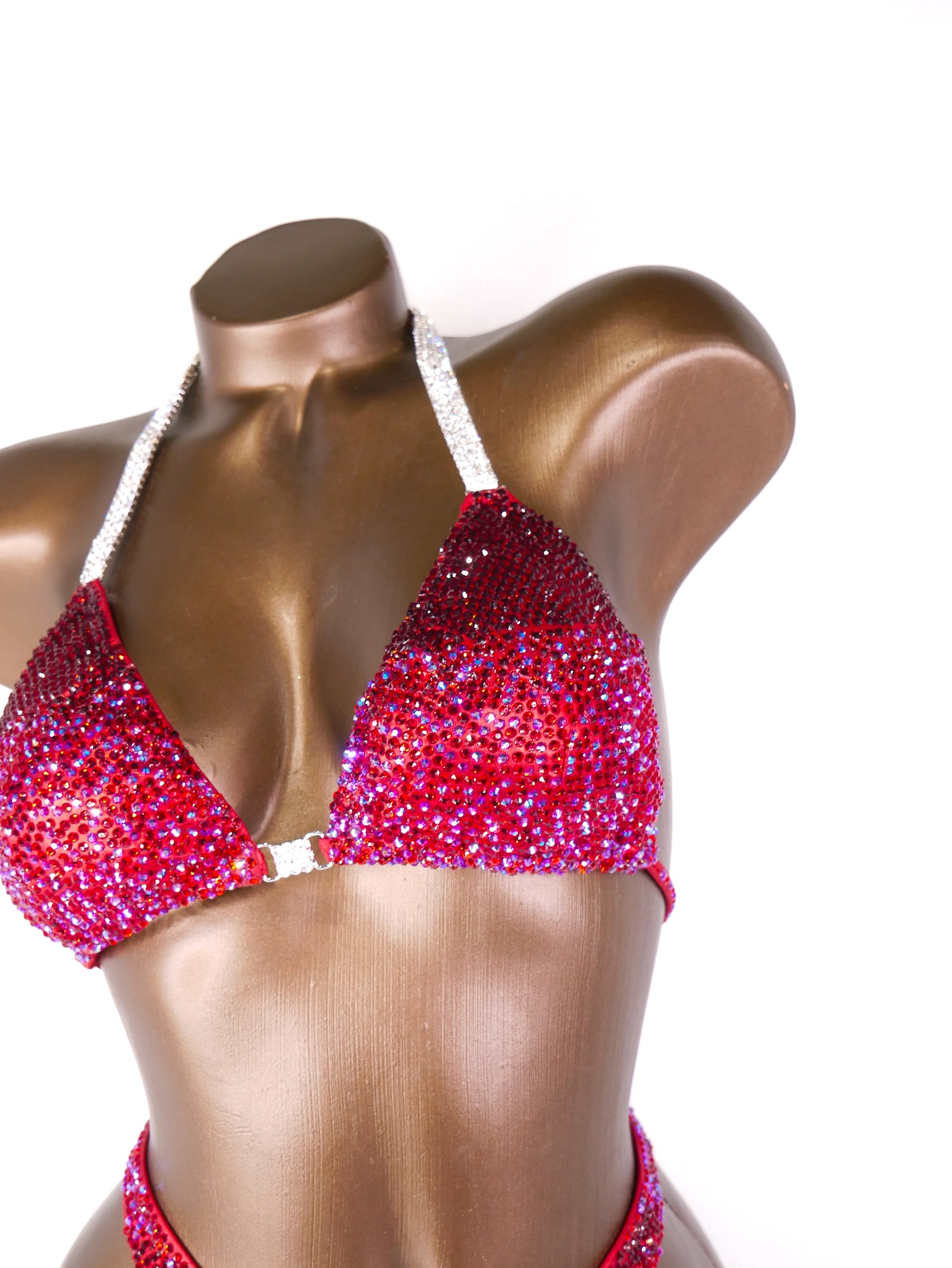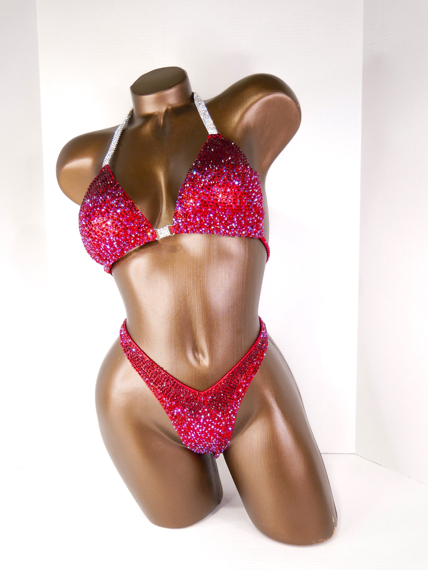 - Features: Triple crystal clear rhinestone connectors at bra, decorated with deep red, & red, and red AB rhinestones, rio back coverage, fully lined
