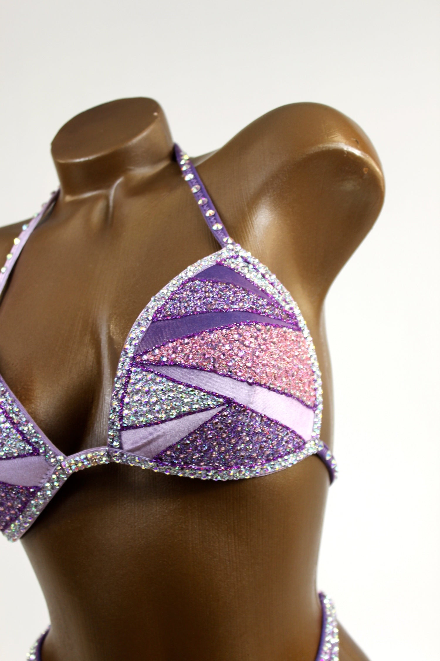 - Features: Rhinestone connector at center bra, decorated with crystal AB, vitrial AB & light amethyst rhinestones, sparkling glitter detail, rio back coverage, fully lined