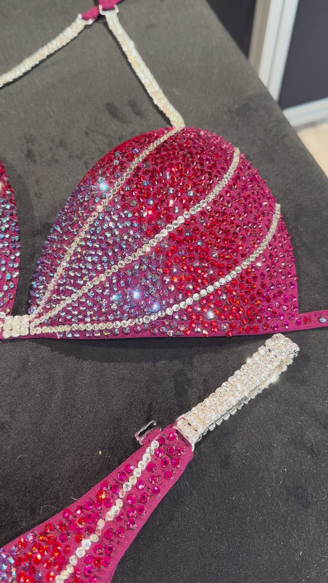 This custom-made competition bikini is designed for athletes competing in NPC, IFBB, WBFF, and OCB events. The Deep Red Ombre design is made to enhance your shape, sparkle under bright stage lighting, and fit perfectly to your measurements.